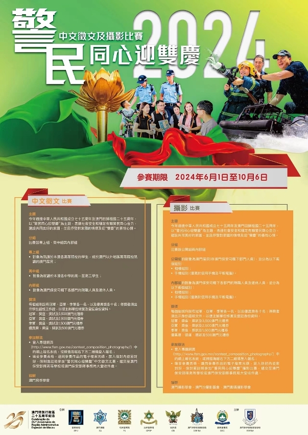 為喜迎中華人民共和國成立七十五周年、澳門特別行政區成立二十五周年,涵養家國情懷及發揚警民同心精神,澳門保安部隊及保安部門今年舉辦的中文徵文比賽及攝影比賽以“警民同心迎雙慶”為主題,表達社會安全和穩定有賴警民齊心建設共同美好的家園,並且抒發對家國的情懷及迎“雙慶”的喜悅心情。兩項比賽的徵集期均於2024年6月1日至10月6日期間接受報名,歡迎踴躍參加。