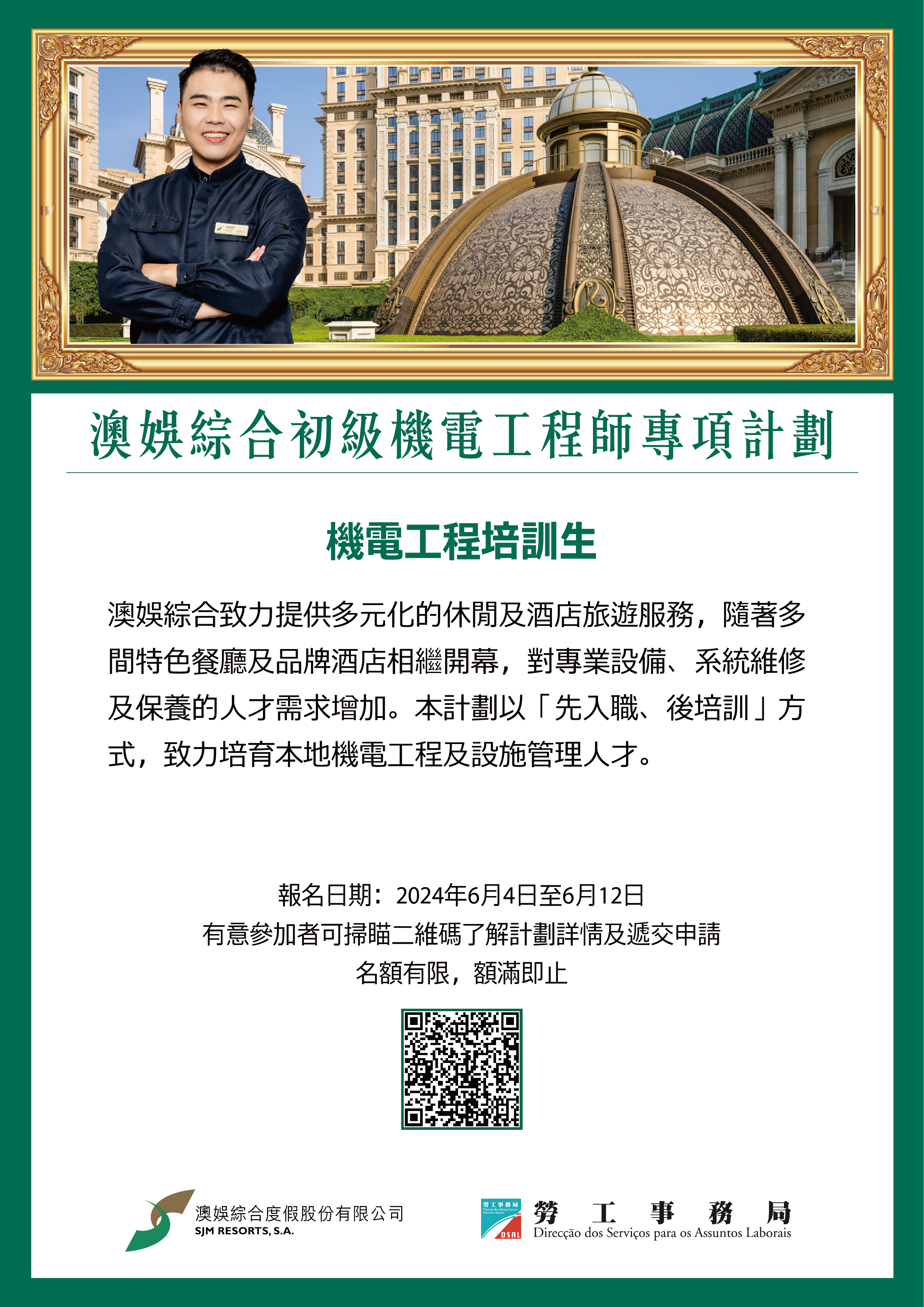 為致力培育本地機電工程及設施管理人才,勞工事務局和澳娛綜合度假股份有限公司(下稱“澳娛綜合")合作推出“澳娛綜合初級機電工程師專項計劃"(下稱“計劃"),以“先入職、後培訓”方式,為有志投身綜合休閒旅遊服務行業的澳門居民提供全方位培訓及發展階梯,計劃由6月4日起接受申請。