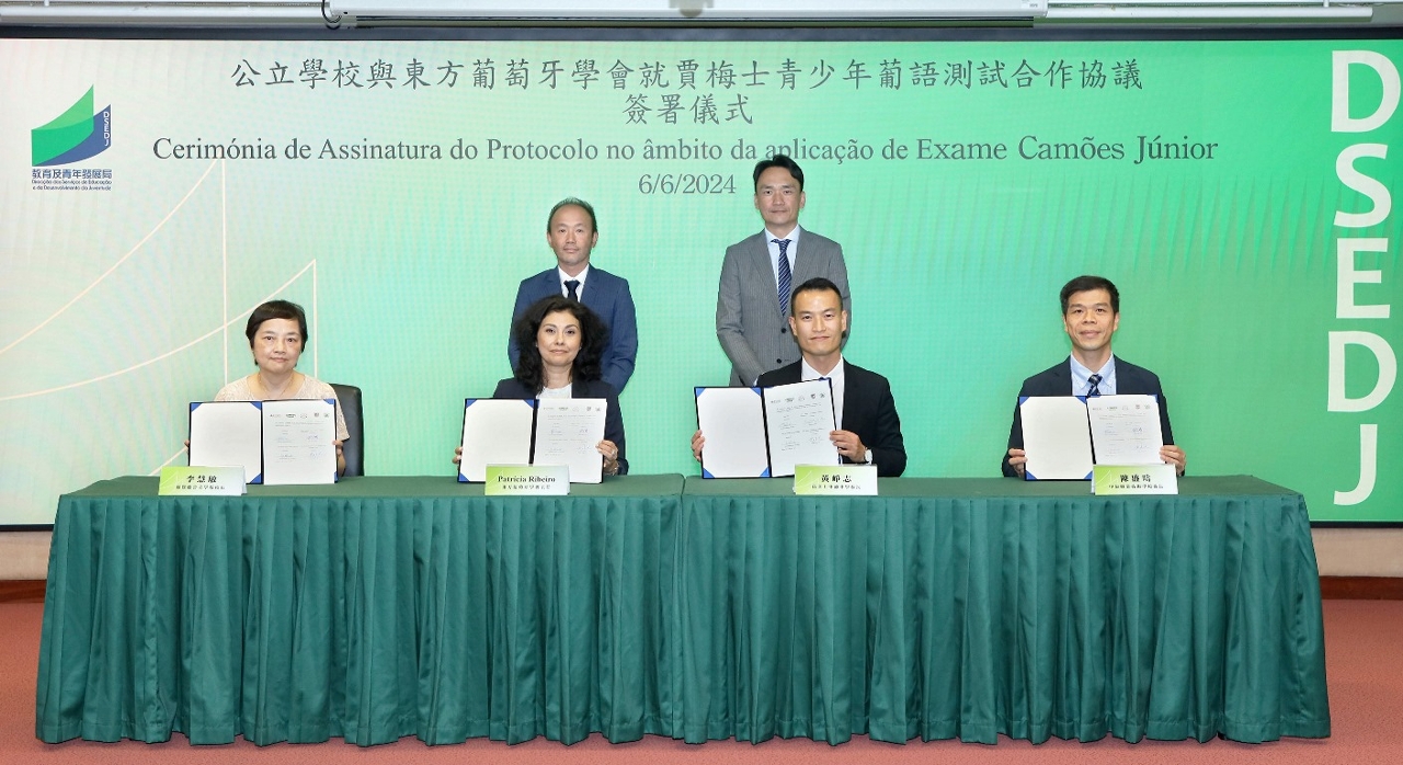 合作協議簽署儀式於2024年6月6日在教青局仲尼堂舉行。在教育及青年發展局局長龔志明和東方葡萄牙學會代表Ricardo Silva的見證下,三所公立學校校長與東方葡萄牙學會主席共同簽署合作協議書。合作協議內容包括設置及組織學生參加賈梅士青少年葡語測試,定期舉辦葡語教師專業培訓及葡語學術交流會等多項具體措施,提升教師的葡語教學效能及學生的葡語應用水平。
