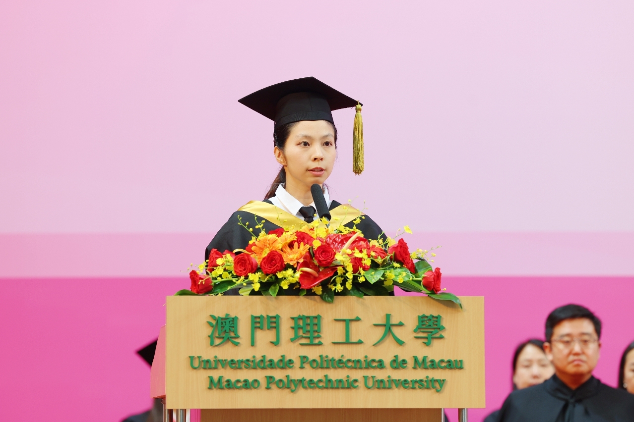 畢業生代表、運動及體育碩士學位課程蘇楚雯致謝詞,感謝澳門特區政府支持青年人才培養,透過持續優化教育建設、提升教學質量、完善青年政策、推動愛國教育等,多管齊下促進青年的全人發展。同時感謝澳理大的全方位培育、老師們的傾囊相授、同學們的並肩相伴,以及家人們的備至關懷。期望畢業生砥礪前行,把握機遇,展望未來,共同為國家及澳門貢獻所長。
