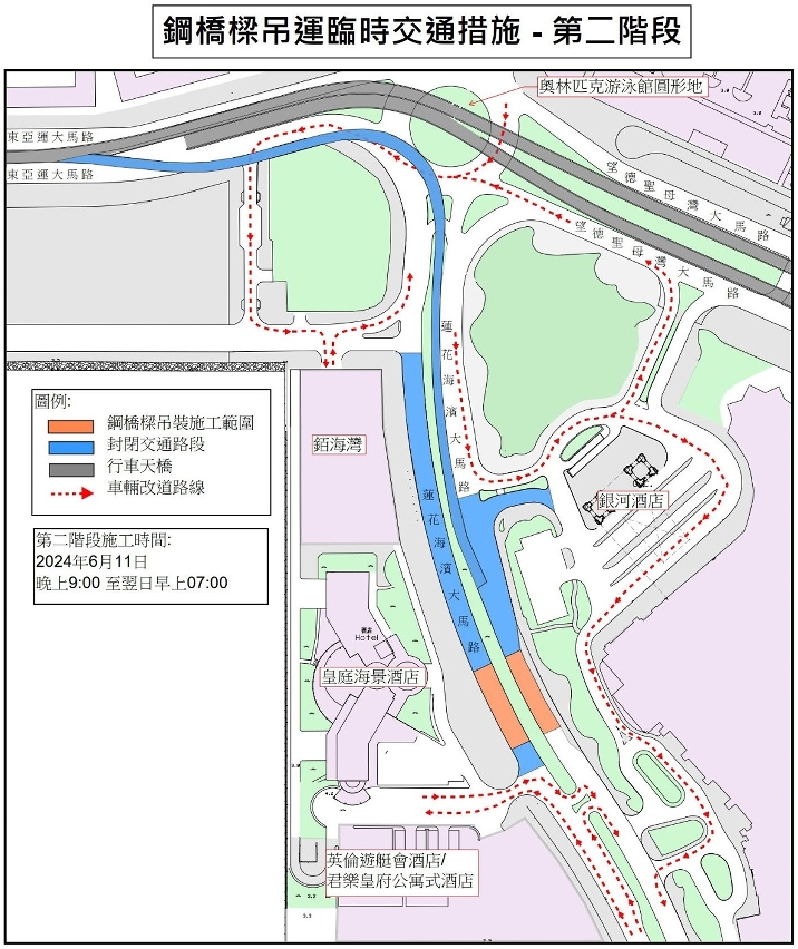 因應吊裝行人天橋主體鋼結構第二階段工程,6月11日晚上9時至翌日上午7時,皇庭海景酒店與奧林匹克游泳館圓形地之間的一段蓮花海濱大馬路、奧林匹克游泳館圓形地行車天橋(東亞運大馬路往蓮花海濱大馬路方向)封閉交通。