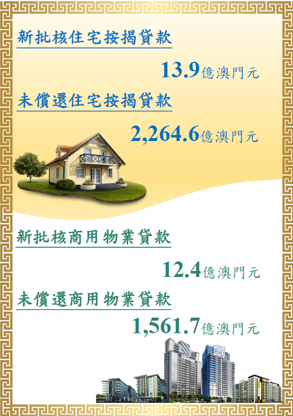 住宅按揭貸款是以澳門境內住宅物業作抵押借予個人及公司的信貸安排,包括用於購買住宅物業及其他用途(如:轉按/加按、營運資金及貿易融資等)。商用物業貸款是以澳門境內商用物業作抵押借予個人及公司的信貸安排,包括借予建築公司、用於物業發展及投資的貸款。