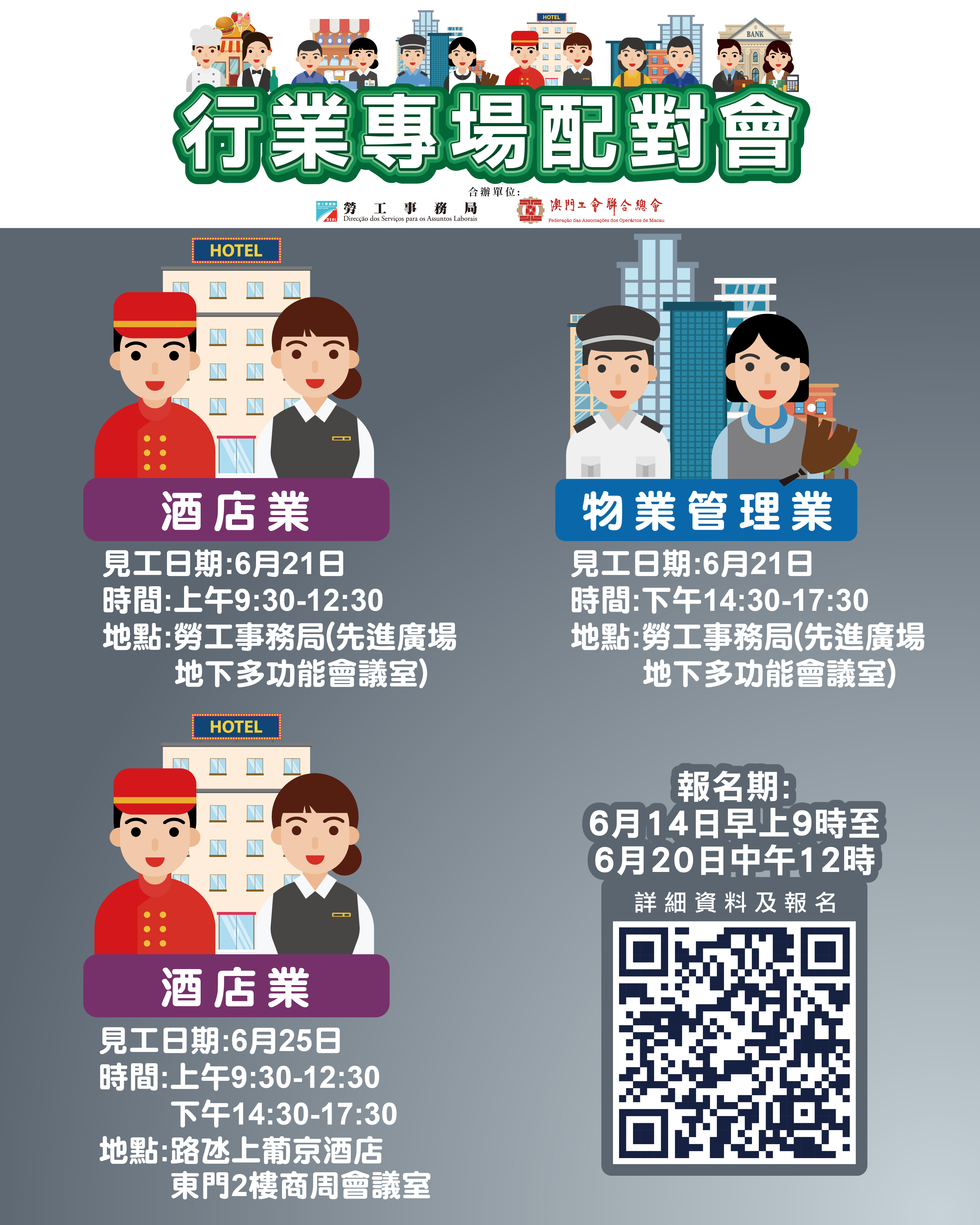 6月21日上午酒店業配對會及下午物管業配對會在澳門勞工事務局地下多功能會議室(澳門馬揸度博士大馬路221-279號先進廣場大廈)舉行;6月25日酒店業配對會在澳門上葡京2樓商周會議室舉行。報名日期為6月14日上午9時至6月20日中午12時。