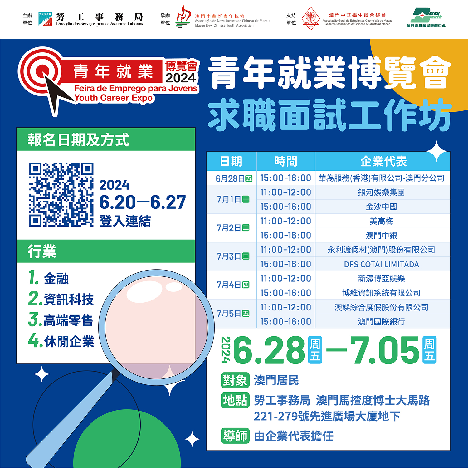 參與“青年就業博覽會2024”的大型招聘的企業,目前已超過50家,並收集到近1,500個職缺。勞工局針對參與招聘的相關行業,如金融業、資訊科技業及綜合休閒服務業,邀請相關企業的資深人資顧問擔任工作坊導師,由6月28日至7月5日合共推出11場求職面試工作坊,為即將進入職場的求職青年介紹行業發展前景,教授求職面試和撰寫履歷的技巧,讓青年做好應徵面試的準備。