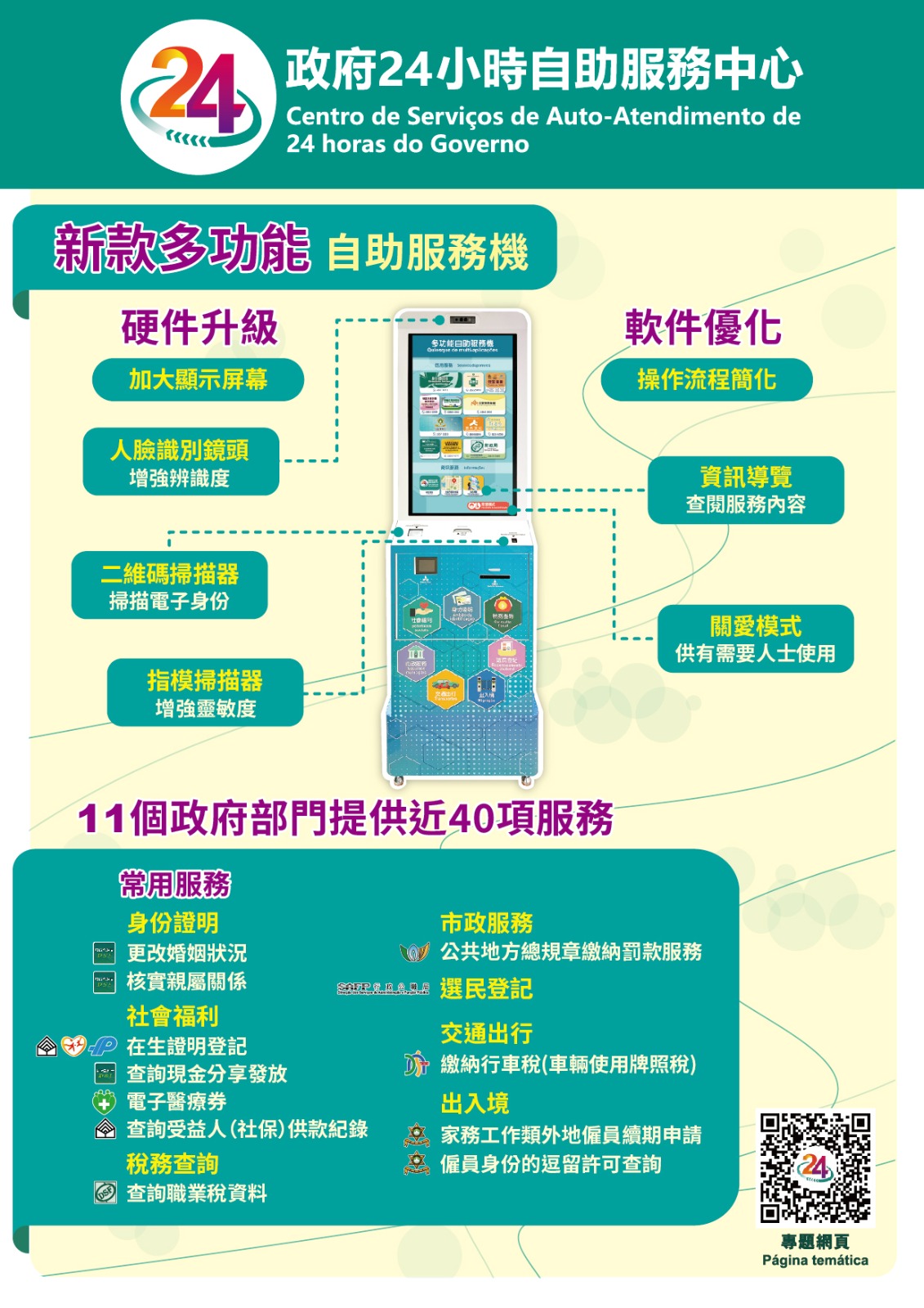 透過跨部門持續合作,現時全澳逾40個地點共設置逾70台新款多功能自助服務機,提供有關身份證明、社會福利、稅務查詢、市政服務、選民登記、交通出行及出入境共7個類別,涉及11個部門接近40項自助服務。