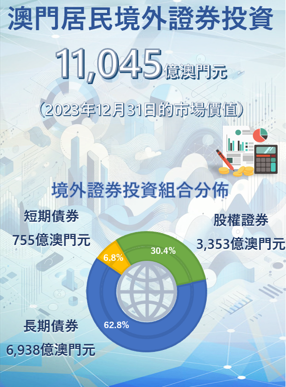 澳門金融管理局今(26)日發佈的統計顯示,在2023年12月31日,澳門居民(包括個人、政府及其他法人,但不含澳門特別行政區的外匯儲備)持有由境外無關連實體發行的證券投資,以當天市場價值計算為11,045億元(澳門元,下同),與2023年6月30日及2022年底比較,分別錄得3.0%和9.7%的升幅。在各類證券投資中,股權證券(包括互惠基金與投資信託單位)、長期債券及短期債券的市值分別為3,353億元、6,938億元及755億元。與2022年底比較,股權證券和長期債券的市值分別上升4.4%及16.5%,而短期債券的市值則下降16.4%。