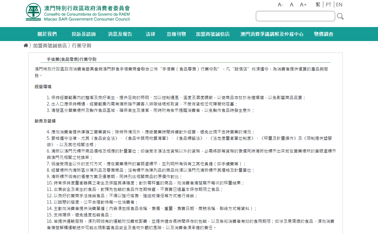 “手信業(食品零售)行業守則”已載於消委會網頁(https://www.consumer.gov.mo/Shop/ShopInt.aspx?lang=zh)供查閱。