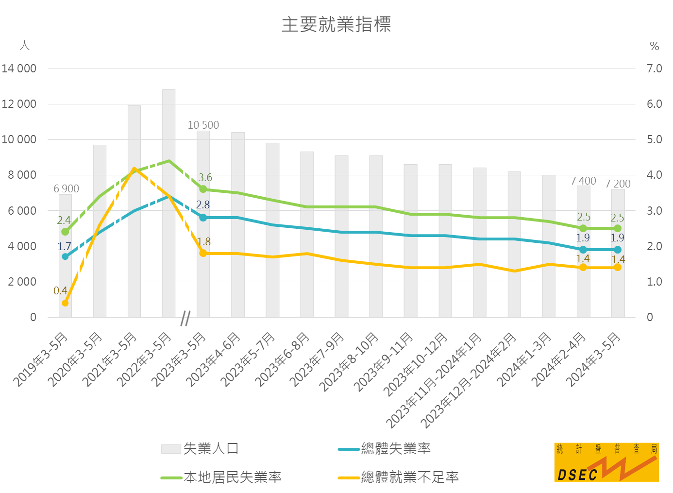 統計暨普查局資料顯示,2024年3月至5月總體失業率(1.9%)及本地居民失業率(2.5%)在連續下跌兩期後與上一期(2024年2月至4月)持平,兩項指標已接近2019年同期水平;就業不足率(1.4%)亦維持在上一期水平。