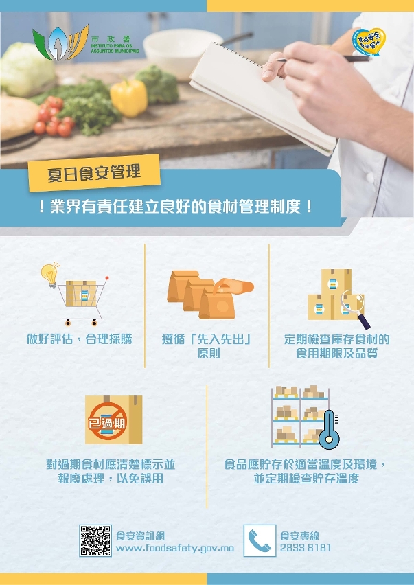 澳門步入夏季,天氣高溫潮濕,一旦食品貯存、處理不當容易變壞。為保障食品安全,市政署持續對本澳各類食品生產經營場所加強食安巡查及宣傳教育工作。提醒業界在迎接旅遊旺季同時,亦必須做好夏季食安管理工作,保障食品質量與安全。