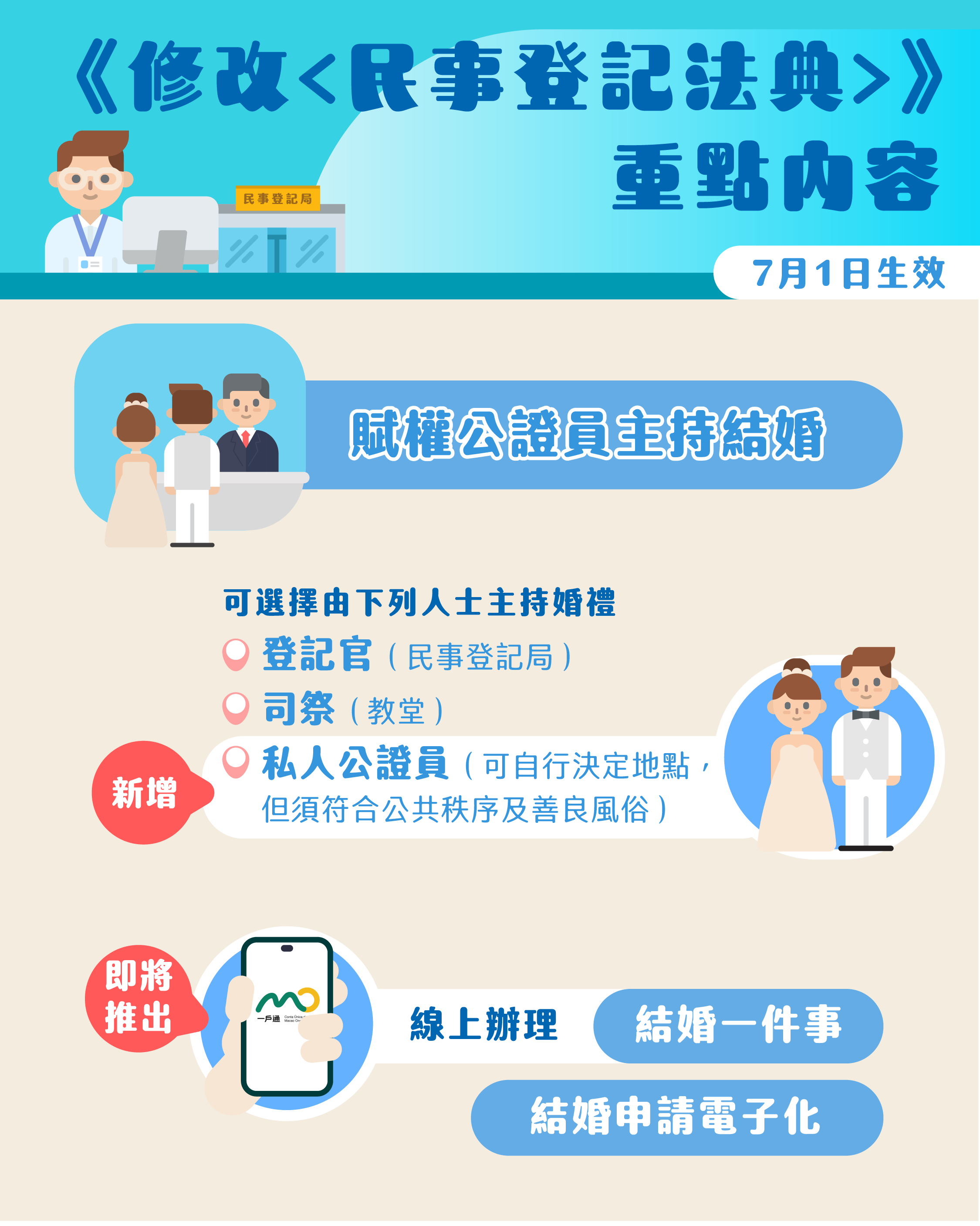 為讓市民了解第11/2024號法律《修改〈民事登記法典〉》的內容,法務局已開通“民事登記專頁網站”(https://online-service.rn.dsaj.gov.mo/civil/civil-info/home),並透過“澳門法務局”、“DSAJRAEM”微信訂閱號及Facebook專頁“普法園地”發佈圖文包,歡迎市民關注。