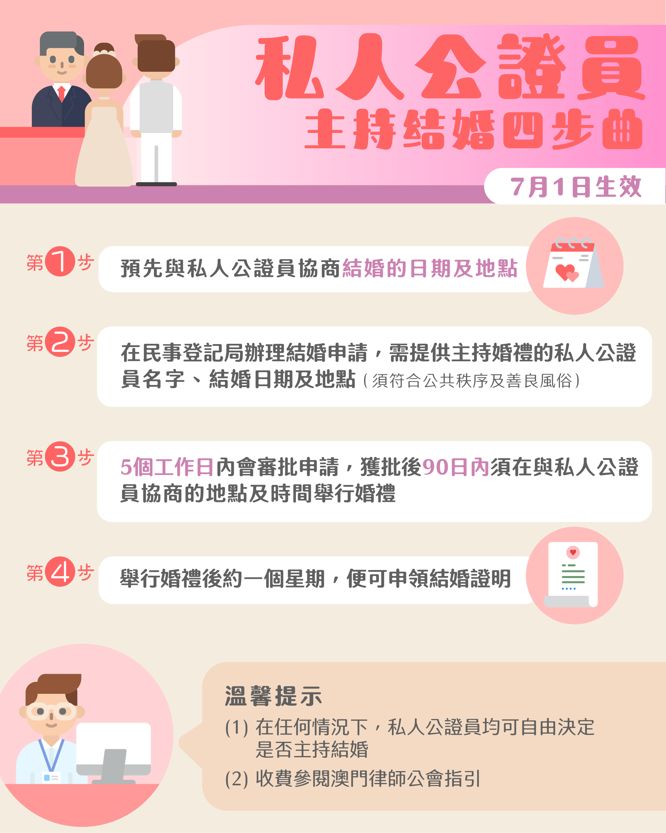第3步:5個工作日內會審批申請,獲批後90日內須在與私人公證員協商的地點及時間舉行婚禮;