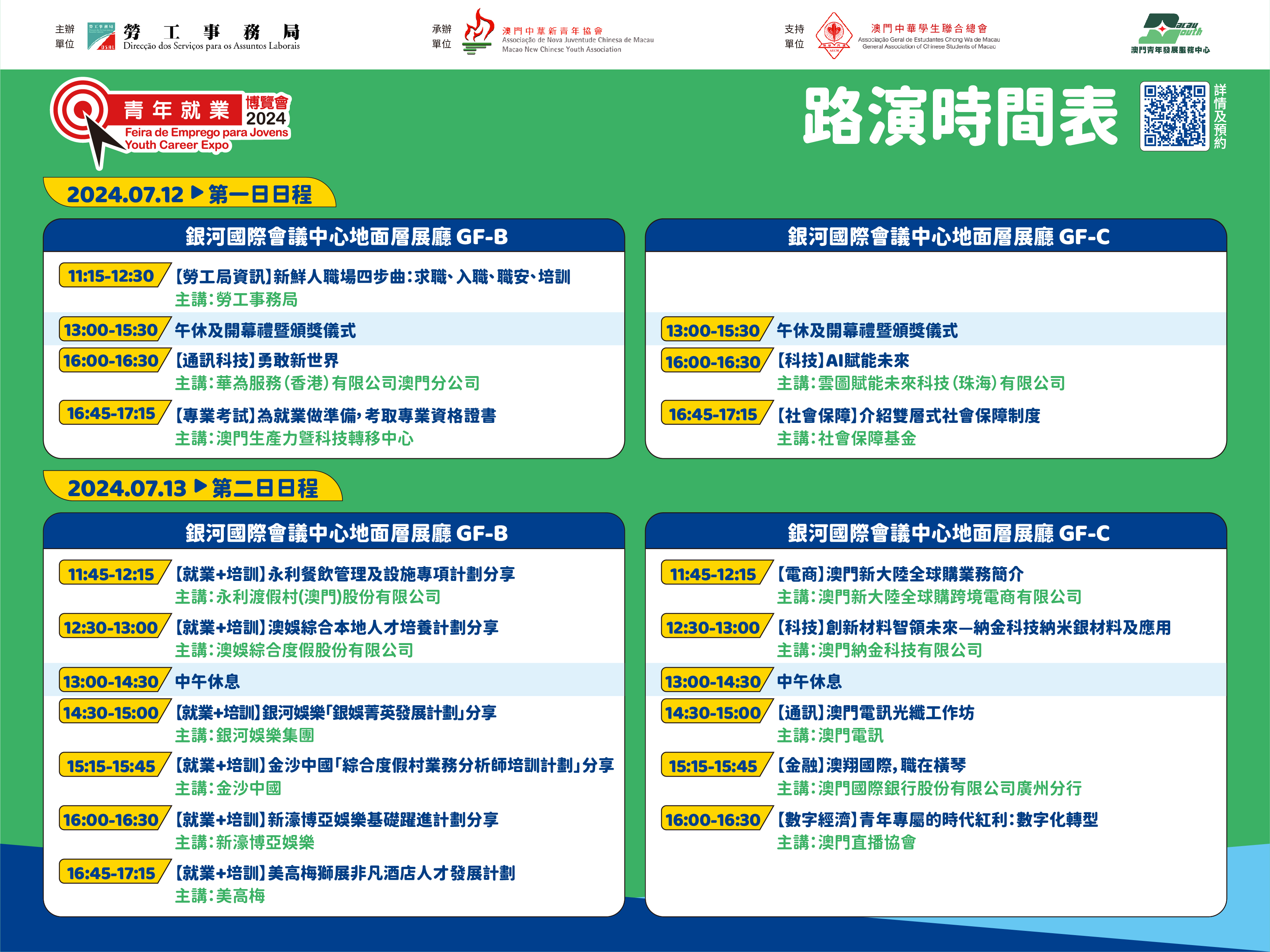 “青年就業博覽會 2024”由勞工事務局主辦,澳門中華新青年協會承辦並由澳門中華學生聯合總會及澳門青年發展服務中心支持,定於7月12日至13日假銀河國際會議中心舉行。今年主題為“展·未來新視界、探·就業新動向”,活動內容豐富,博覽會期間場館內設多項活動,包括有論壇、“1+4”行業講座、互動體驗展區等服務,明(2日)起網上接受預約進場。