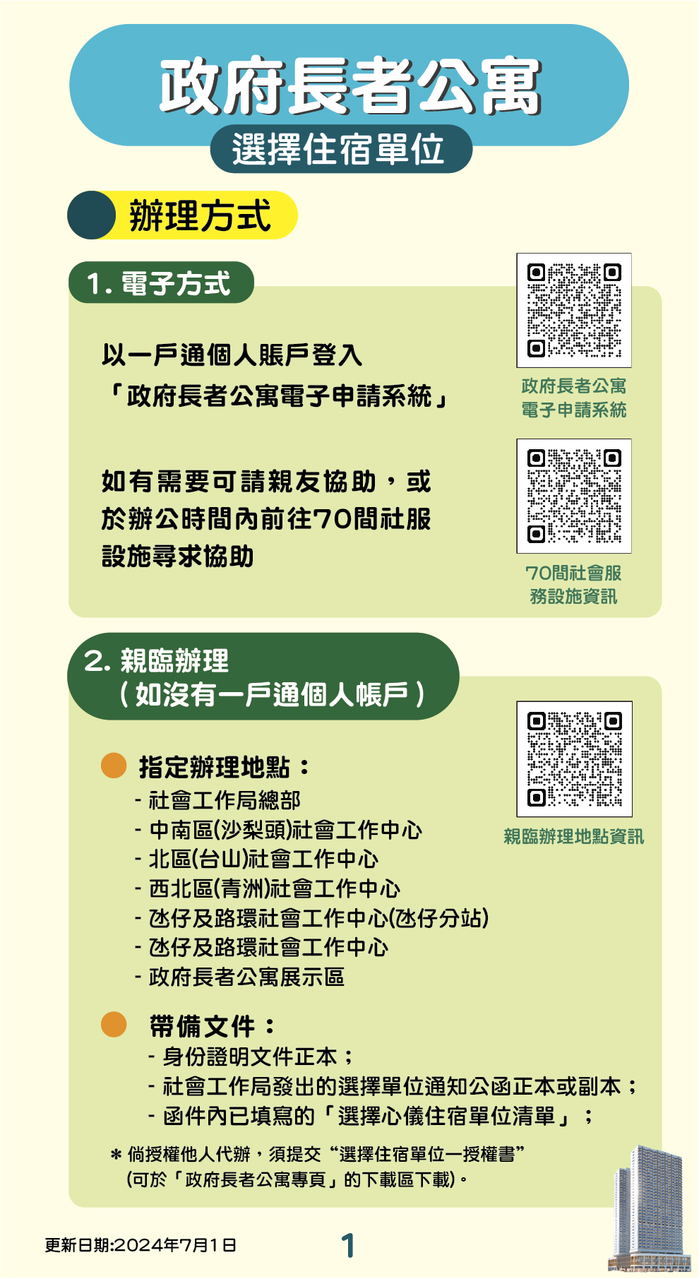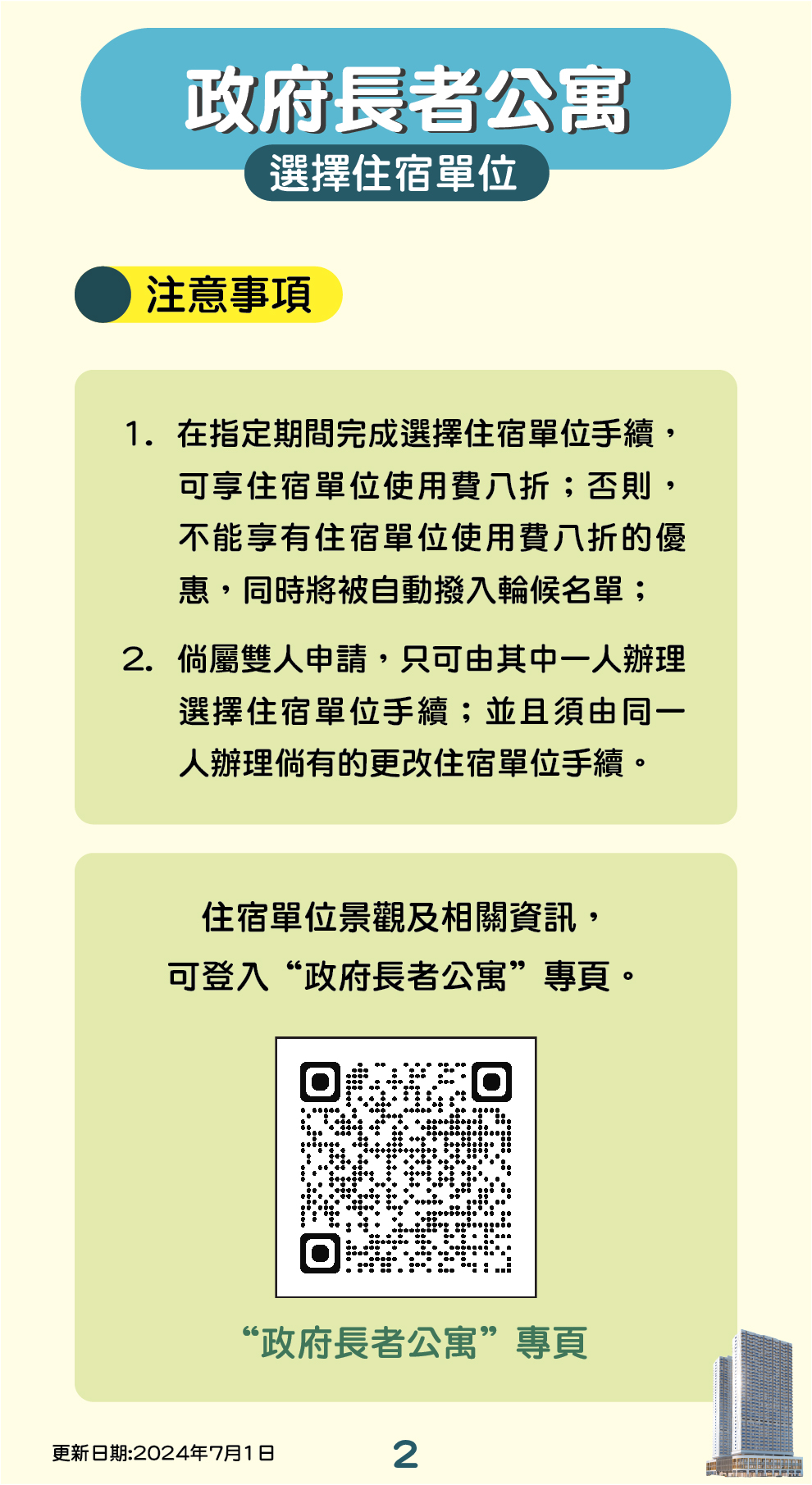 社會工作局自7月8日起分批安排合資格申請人選擇心儀的住宿單位,詳情可參考“政府長者公寓專頁”https://www.ias.gov.mo/government_elderly_apartments之“選擇單位資料”,基本情況如下: