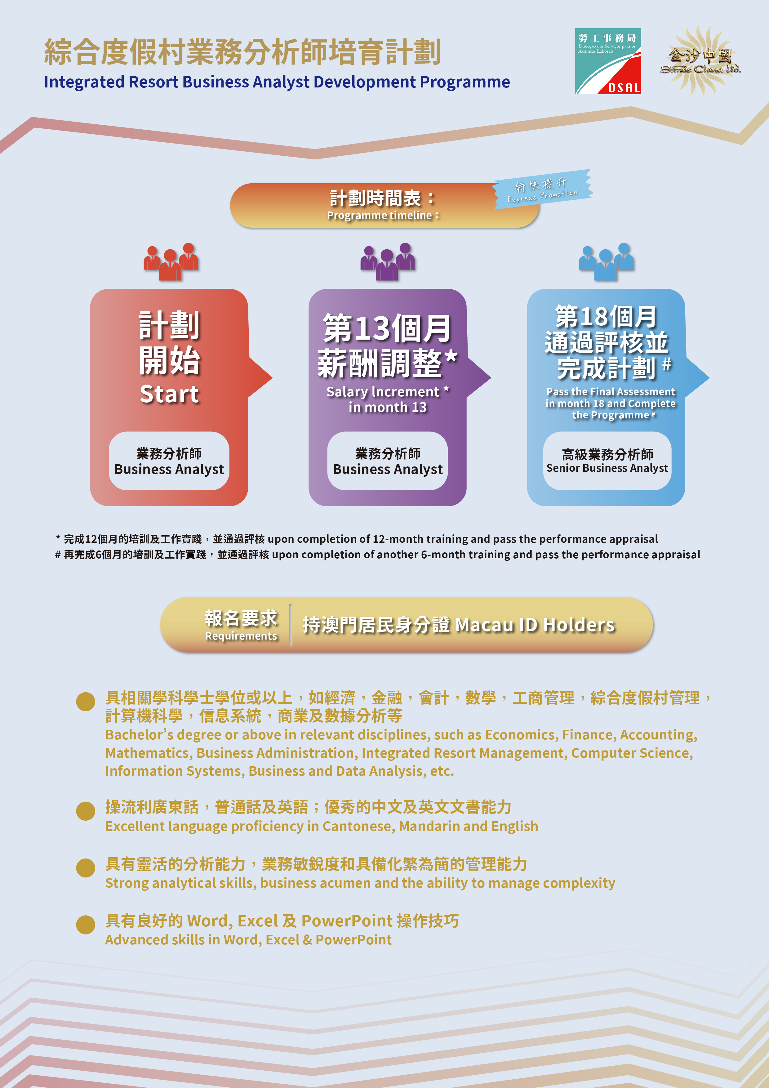 為進一步培育本澳大數據人才,並提供職涯發展階梯,勞工事務局和金沙中國有限公司(下稱“金沙中國")合作推出“綜合度假村業務分析師培育計劃"(下稱“計劃"),以“先入職、後培訓”方式,協助具條件和有意從事綜合度假村業務分析工作的澳門居民就業,計劃由7月4日起接受申請。