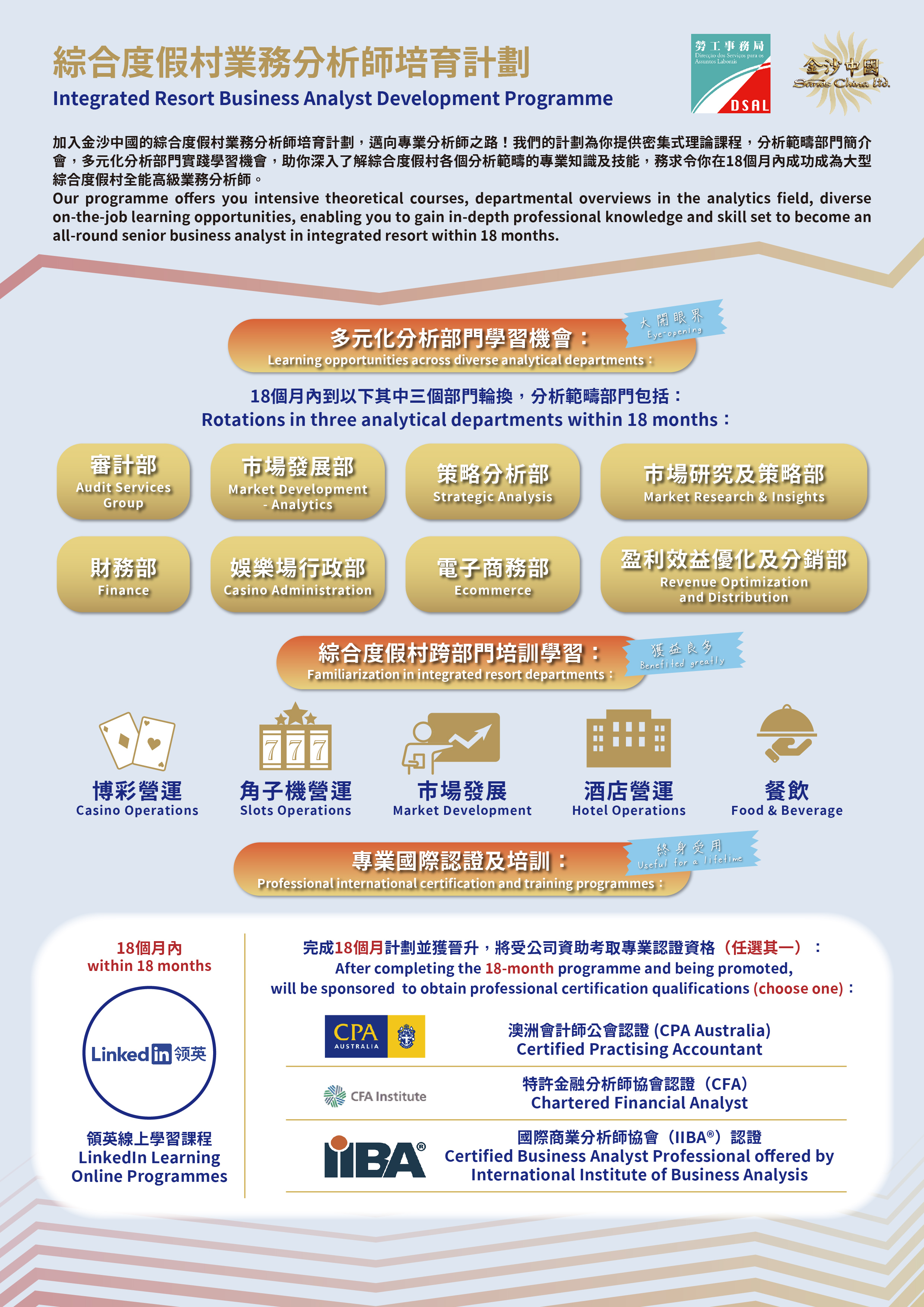 計劃提供“業務分析師”職缺20個,獲錄取參加計劃者,將接受一系列培訓,內容包括多元化分析部門實踐學習、綜合度假村跨部門學習、由高管指導完成公司業務分析項目及分享等。在完成兩個階段合共18個月培訓及工作實踐,並通過考核後可晉升為“高級業務分析師”,屆時將接受公司資助考取專業國際認證及資格等,助培訓生做好裝備,快速拓展職業生涯。