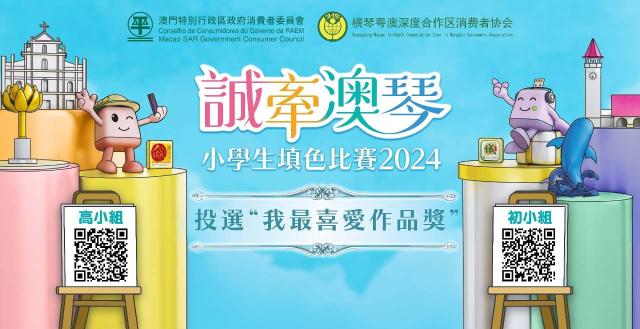 澳門特別行政區政府消費者委員會與橫琴粵澳深度合作區消費者協會合辦“誠牽澳琴”小學生填色比賽,早前澳門區展開的投選“我最喜愛作品獎”活動,將於本月12日結束,參與投票將有機會獲得“競猜最喜愛作品獎”的抽獎資格。