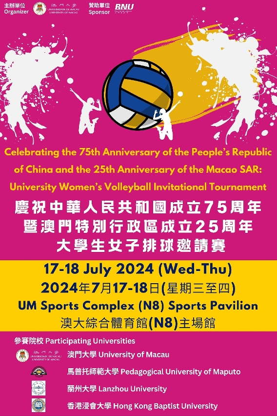 由澳門大學主辦的“慶祝中華人民共和國成立75周年暨澳門特別行政區成立25周年—大學生女子排球邀請賽”將於7月17日(星期三)至18日(星期四)在澳大舉行,來自澳門大學、香港浸會大學、蘭州大學和莫桑比克馬普托師範大學的女子排球隊將同場競技,歡迎有興趣人士到場觀賽。賽事由大西洋銀行贊助。