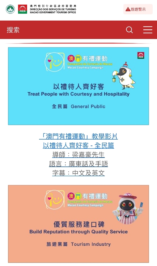 旅遊局在今年上半年已為旅遊及零售業界舉辦28場針對性的線下培訓課程、講座及工作坊等,超過3,000人次參與,並製作“澳門有禮運動”線上教學影片及教材,上半年已推出“全民篇”及“旅遊業篇”,錄得逾8,000點擊次數,透過影片及教材介紹行業待客之道和優質服務技巧,促使澳門旅遊業提質發展,增添旅客各方面的遊歷體驗。