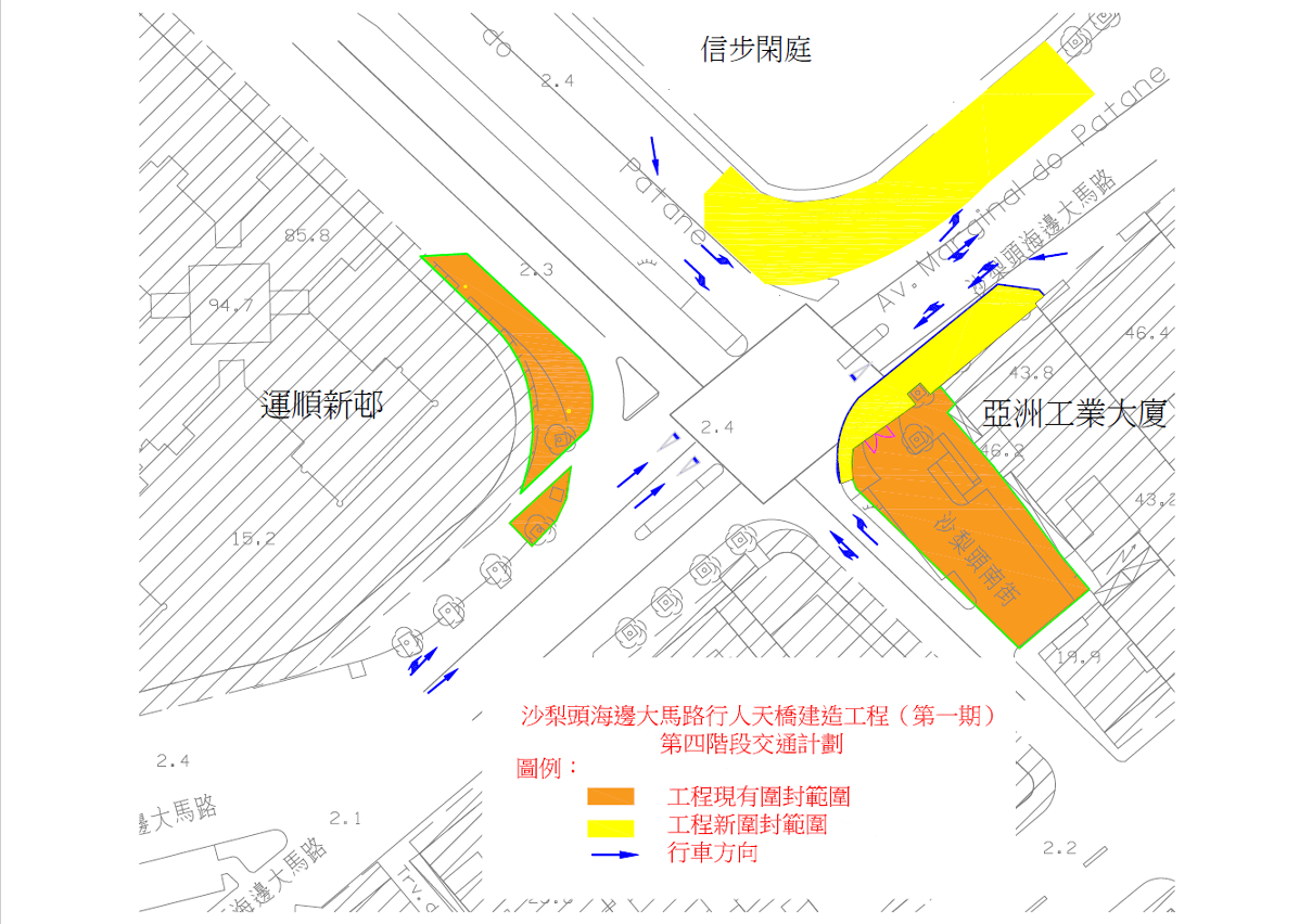 沙梨頭海邊大馬路行人天橋建造工程(第一期)已展開,目前已完成拆除道路上花圃的工作,稍後會調整行車路並於各施工區域進行圍封,以便進行行人天橋的3個落腳點的管線遷移及天橋基礎施工。因此,自8月16日起,沙梨頭海邊大馬路及沙梨頭南街將實施有限度通車,部分停車泊位置需停止使用,請駕駛者留意現場交通指示,相關施工範圍及行車路線(詳見附圖)