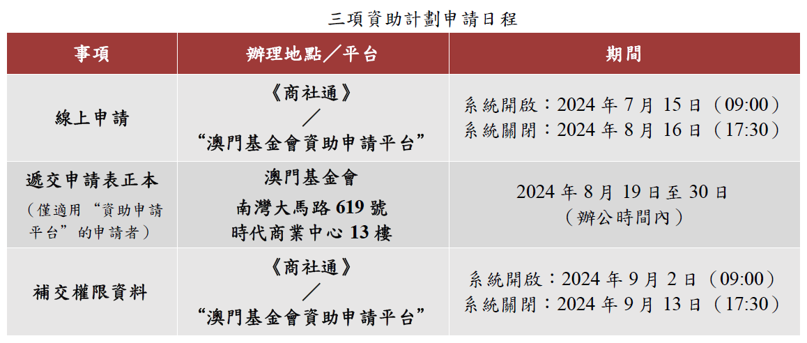 上述三項資助計劃的章程及圖文包已上載澳基會網站www.fmac.org.mo/sponsorship,有意申請者須憑有效帳戶於2024年8月16日下午五時三十分系統關閉前完成提交線上申請,使用“商社通”的申請者須於系統關閉前同時完成面容識別及提交程序。透過“澳基會資助申請平台”提交的申請,在完成線上提交後,須於8月19日至30日的辦公時間內親臨本會遞交由法定代理人或具權限的受權人簽署及蓋上機構蓋章之申請表正本,未有按時交回申請表的申請者將視為自動放棄申請。澳基會呼籲有意申請者儘早辦理,逾期將不再受理。
