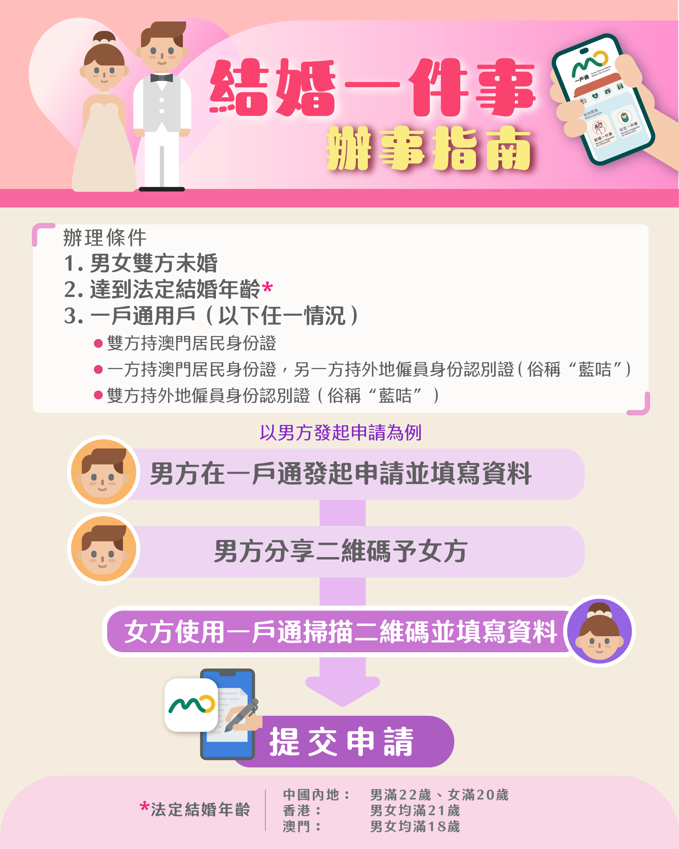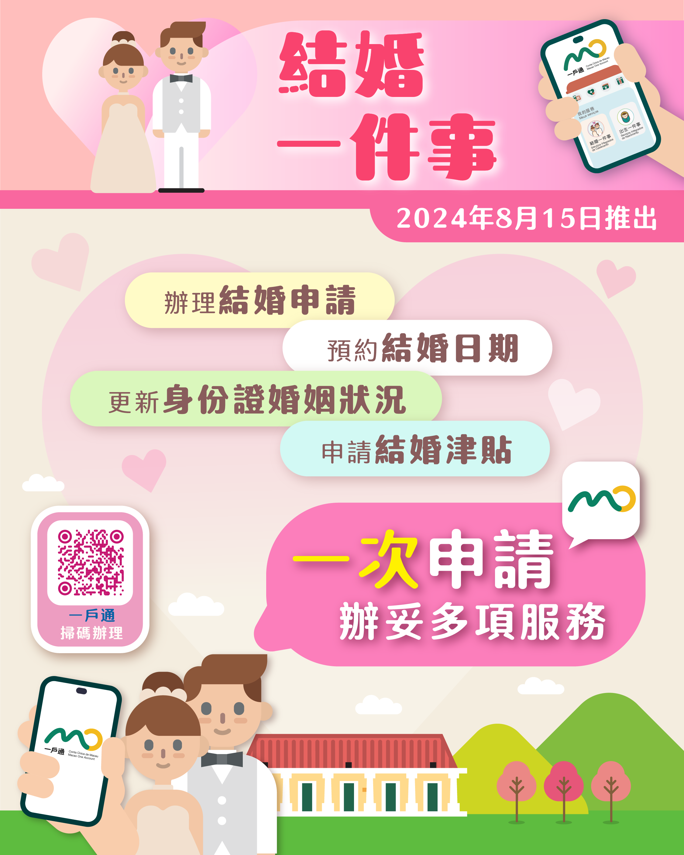 合資格結婚人可透過“結婚一件事”辦理包括結婚申請、預約結婚日期、更新身份證婚姻狀況以及申請結婚津貼的服務,而結婚人還可以選擇由民事登記局登記官、教堂的司祭或者私人公證員主持結婚。此外,如果結婚人選擇由登記官主持結婚,在登記當天便可更新澳門居民身份證的婚姻狀況,並領取結婚證明。“結婚一件事”讓結婚人一次完成辦理多項與結婚相關的行政手續,無需多次前往不同部門。