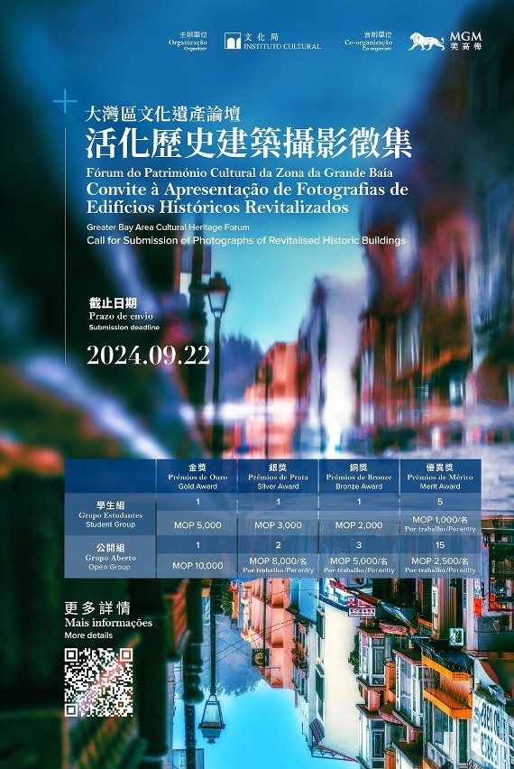藉著今年10月澳門主辦“大灣區文化遺產論壇”的契機,文化局配合論壇推出一系列延伸活動,其中包括由文化局主辦、美高梅合辦的“大灣區文化遺產論壇——活化歷史建築攝影徵集”,活動以“澳門活化歷史建築”為題,面向不同年齡層的公眾徵集活化歷史建築的攝影作品,通過社會大眾的角度,展示歷史建築的活化成果。是次攝影徵集分為學生組和公開組兩個組別,每組分別設金、銀、銅和優異獎;學生組和公開組的最高獎金分別為5,000及10,000澳門元。