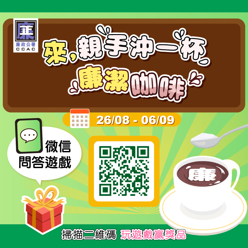 廉政公署為讓大眾進一步認識《預防及遏止私營部門賄賂》、《預防及遏止對外貿易中的賄賂行為的制度》等法律及廉署職能,特別推出“親手沖一杯廉潔咖啡”微信問答遊戲,期望大眾透過參與遊戲,積極參與廉政建設,知法守法,支持廉署工作,共建廉潔社會。
