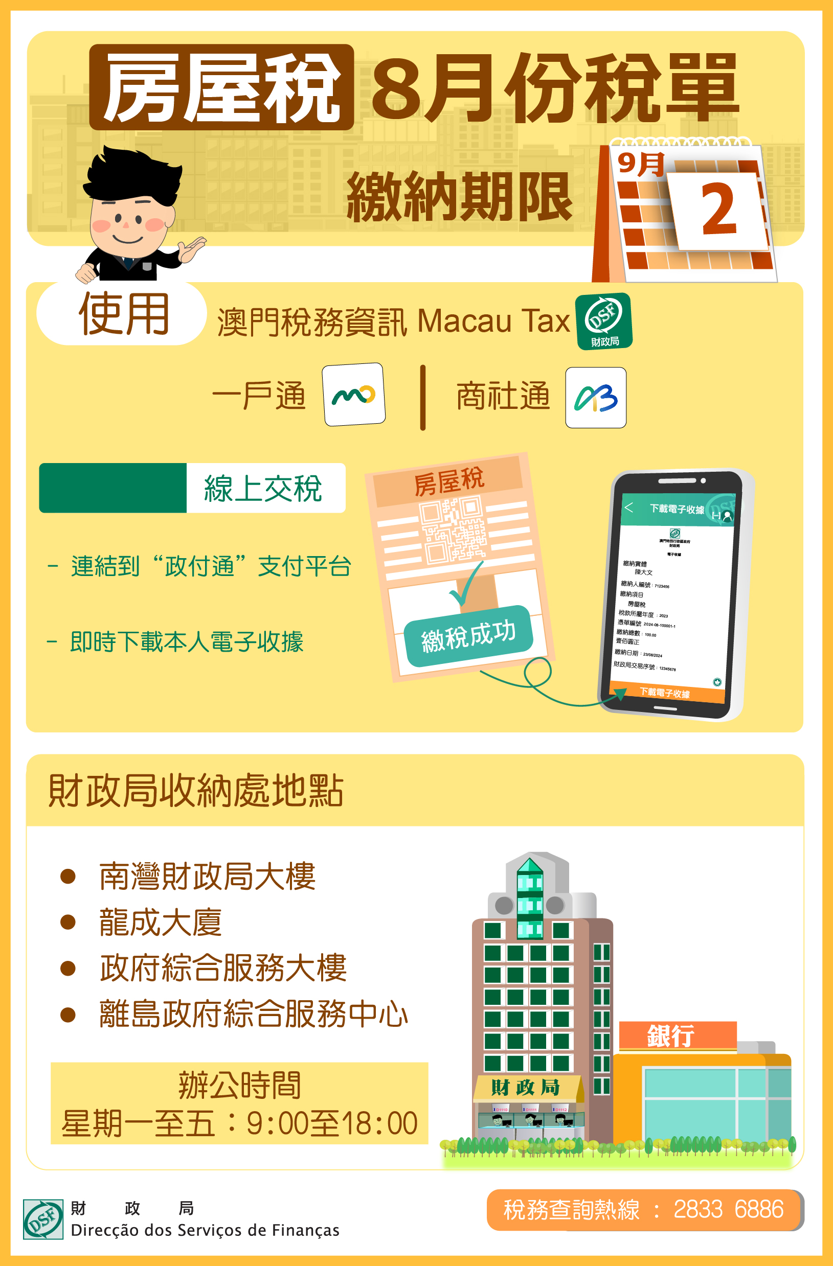 財政局提醒房屋稅納稅人,2023年度房屋稅徵稅憑單上繳納月份屬8月的房屋稅,繳納期限至9月2日屆滿,仍未繳納上述房屋稅的納稅人應儘快繳納,避免因逾期繳納而須附加過期利息和罰款。