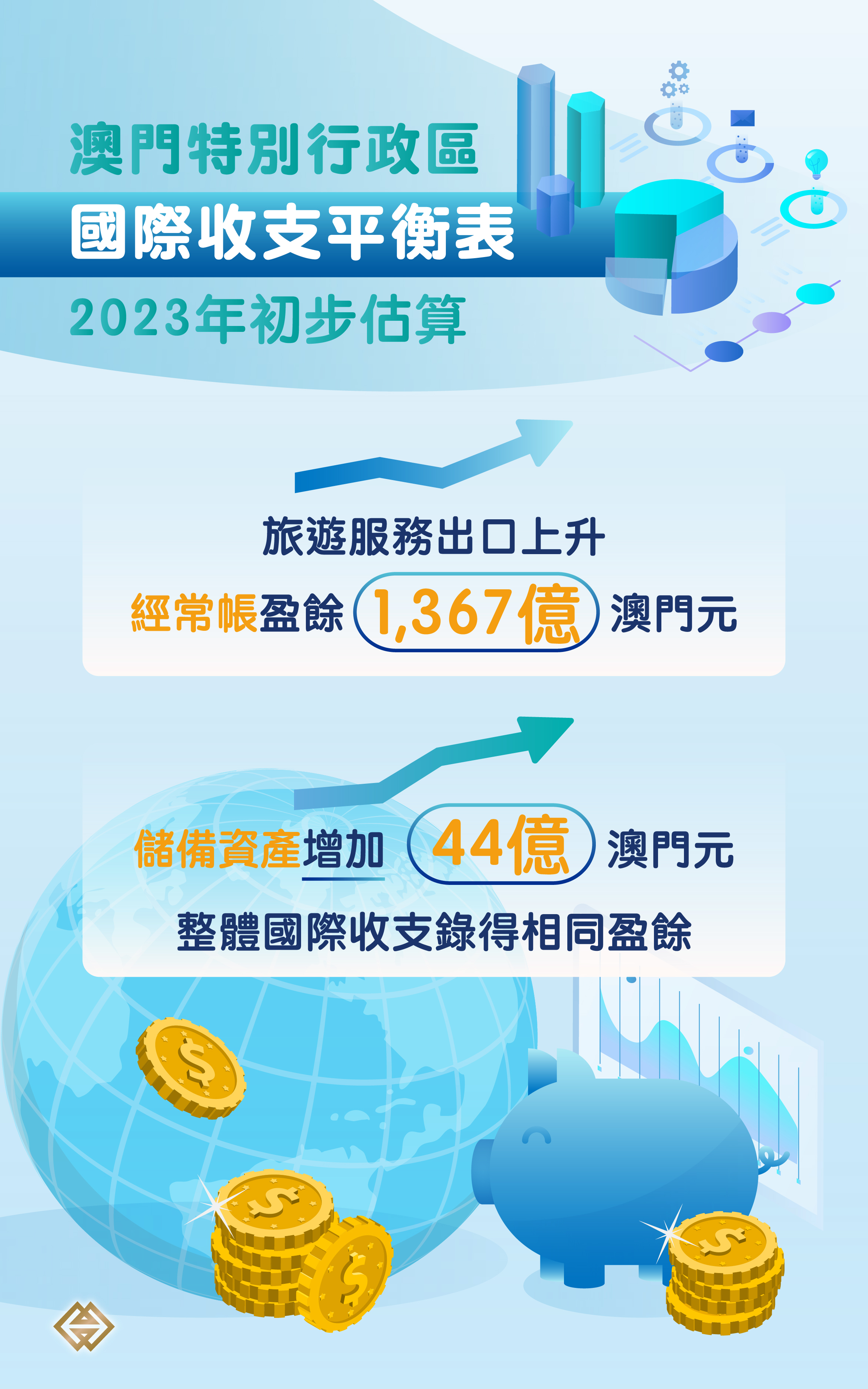 金融帳內的儲備資產,主要用以顯示由澳門金融管理局所持有的澳門特區外匯儲備的變動情況。在撇除價格及匯率變動等因素影響後,儲備資產增加了44億,表示2023年的整體國際收支錄得相同金額的盈餘。