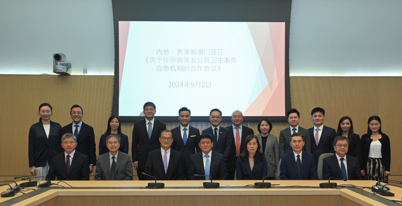 隨後,王賀勝局長、盧寵茂局長、歐陽瑜司長共同簽署了《國家疾病預防控制局、香港特別行政區政府醫務衞生局、澳門特別行政區政府社會文化司關於傳染病突發公共衛生事件應急機制的合作協議》,旨在加強三地在應對重大傳染病突發公共衛生事件領域的合作與交流,按照“一國兩制”原則,根據相關法律、法規,共同應對重大的傳染病爆發流行,切實保障民眾的健康和生命安全,維護社會穩定和經濟持續發展。協議內容主要包括三地應對重大傳染病突發公共衛生事件領域的合作範圍與機構;信息通報、使用和發佈;人員交流與技術培訓;三地應急協調和聯防聯動;科研合作與交流等。