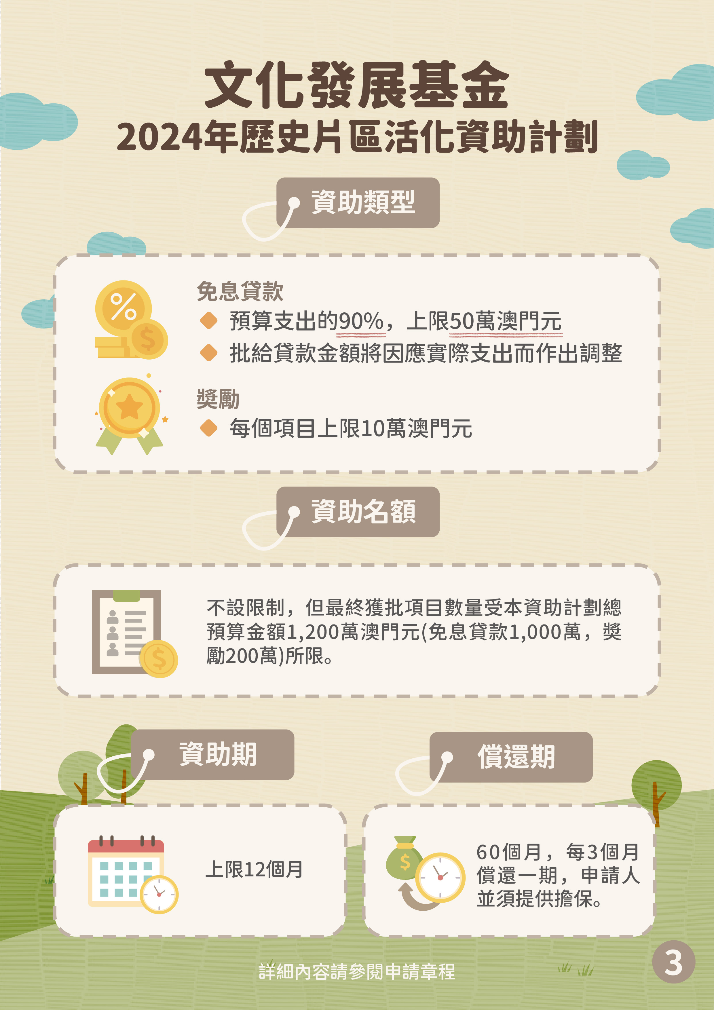 資助形式為免息貸款及奬勵,批給貸款上限為申請項目預算支出的90%,上限50萬澳門元;每個項目獎勵金額上限為10萬澳門元。免息貸款款項可用於項目店舖或空間的營運資金、購置設備、裝修工程、宣傳及推廣等。資助期上限12個月,名額不設限制,直至相關資助計劃預算使用完畢為止,屆時申請期將同時提早結束,並會在基金網站對外公佈有關訊息。