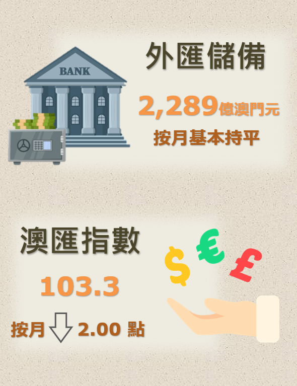 澳門金融管理局今(13)日公佈,2024年8月底澳門特別行政區的外匯儲備資產總額,初步統計為2,289億澳門元(285.0億美元),按月比較基本持平。2024年8月底的外匯資產總額,約相當於2024年7月底澳門流通貨幣的11倍或廣義貨幣供應(M2)中屬於澳門元部分的90.1%。