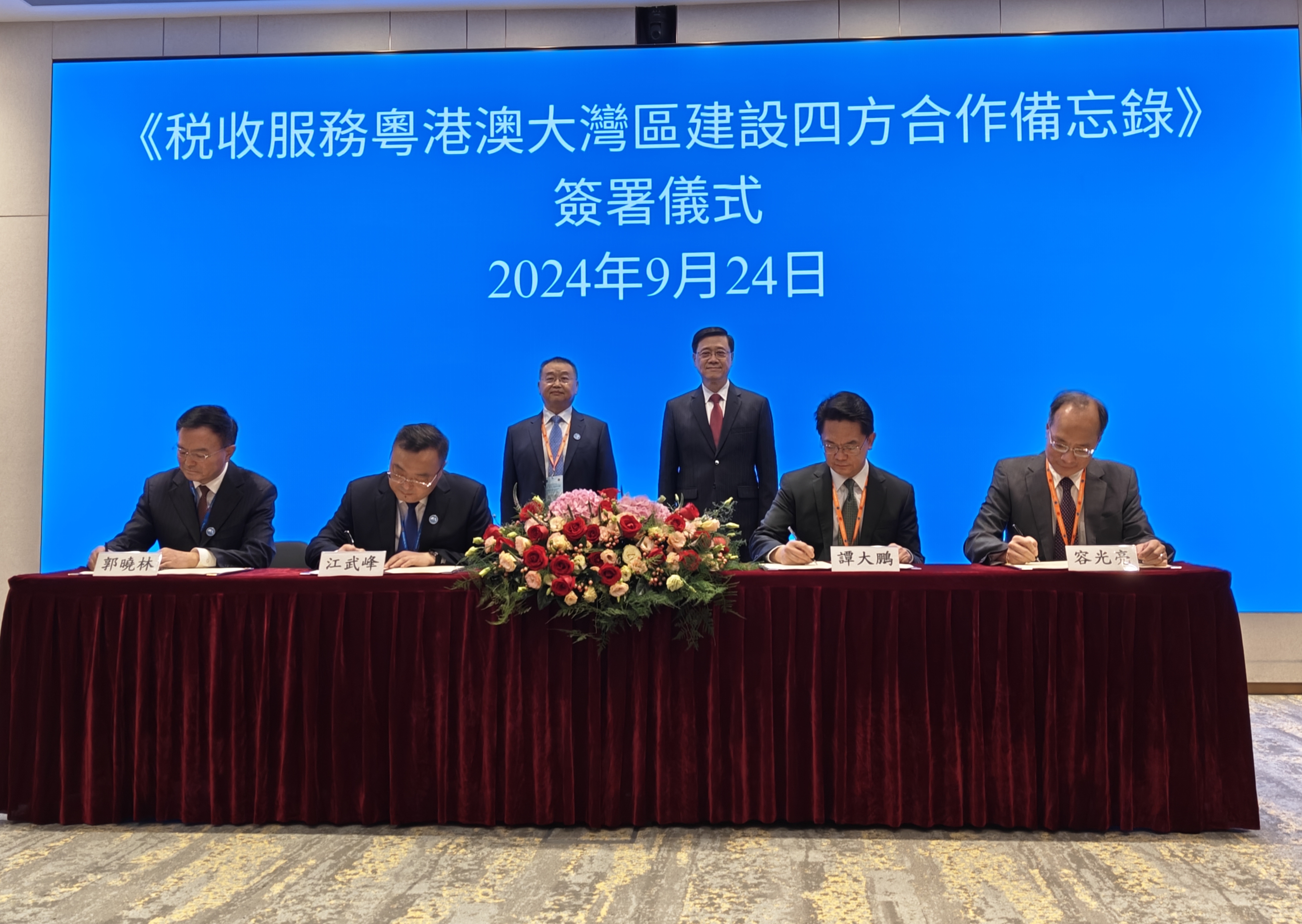 為加強粵港澳深四地間的稅務合作,推動大灣區經濟發展,並提升納稅服務質量,2024年9月24日,國家税務總局廣東省税務局江武峰局長、香港税務局譚大鵬局長、澳門財政局容光亮局長和國家税務總局深圳市税務局郭曉林局長在國家税務總局胡靜林局長和香港行政長官李家超的見證下,於香港正式簽署了《稅收服務粤港澳大灣區建設四方合作備忘錄》(以下簡稱合作備忘錄),這標誌著新一輪稅務合作的開始。