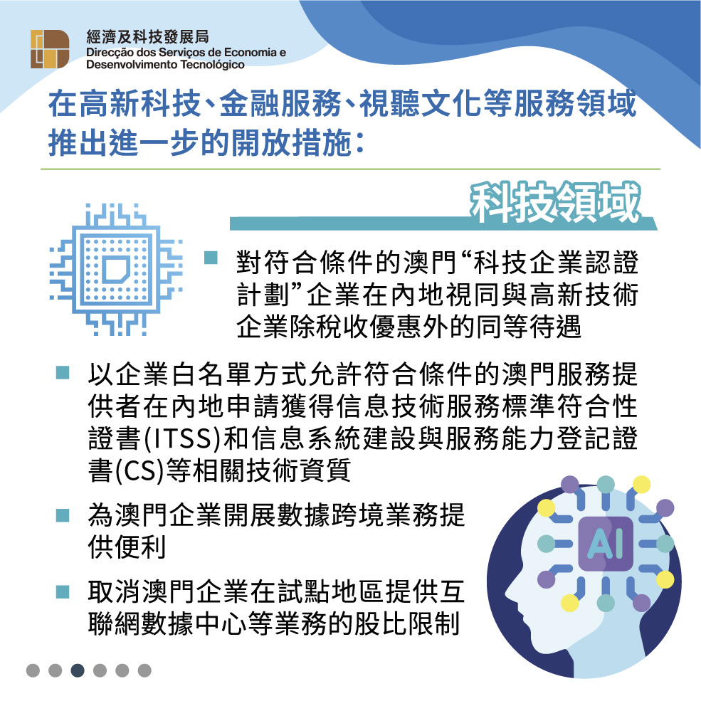 《修訂協議二》增加高新科技、金融服務、視聽文化等服務領域的開放措施,支持澳門“1+4”適度多元發展策略,為澳門經濟適度多元發展創造新空間。科技領域方面,對符合條件的澳門“科技企業認證計劃”企業在內地視同與高新技術企業除稅收優惠外的同等待遇、允許符合條件的澳門服務提供者在內地獲得相關技術資質認可、取消澳門企業在試點地區提供互聯網數據中心等業務的股比限制等。金融服務領域方面,取消澳門銀行5年實質性商業經營的年限要求及境外金融機構入股保險公司年末總資產的限制等。視聽文化領域方面,允許澳門企業投資電影製作、與內地合拍電視劇可視為國產電視劇播出和發行等。