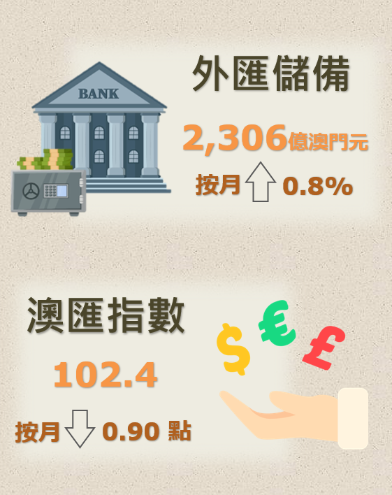 澳門金融管理局今(15)日公佈,2024年9月底澳門特別行政區的外匯儲備資產總額,初步統計為2,306億澳門元(288.1億美元),較2024年8月經修訂總額2,289億澳門元(285.0億美元),上升了0.8%。2024年9月底的外匯資產總額,約相當於2024年8月底澳門流通貨幣的11倍或廣義貨幣供應(M2)中屬於澳門元部分的91.2%。