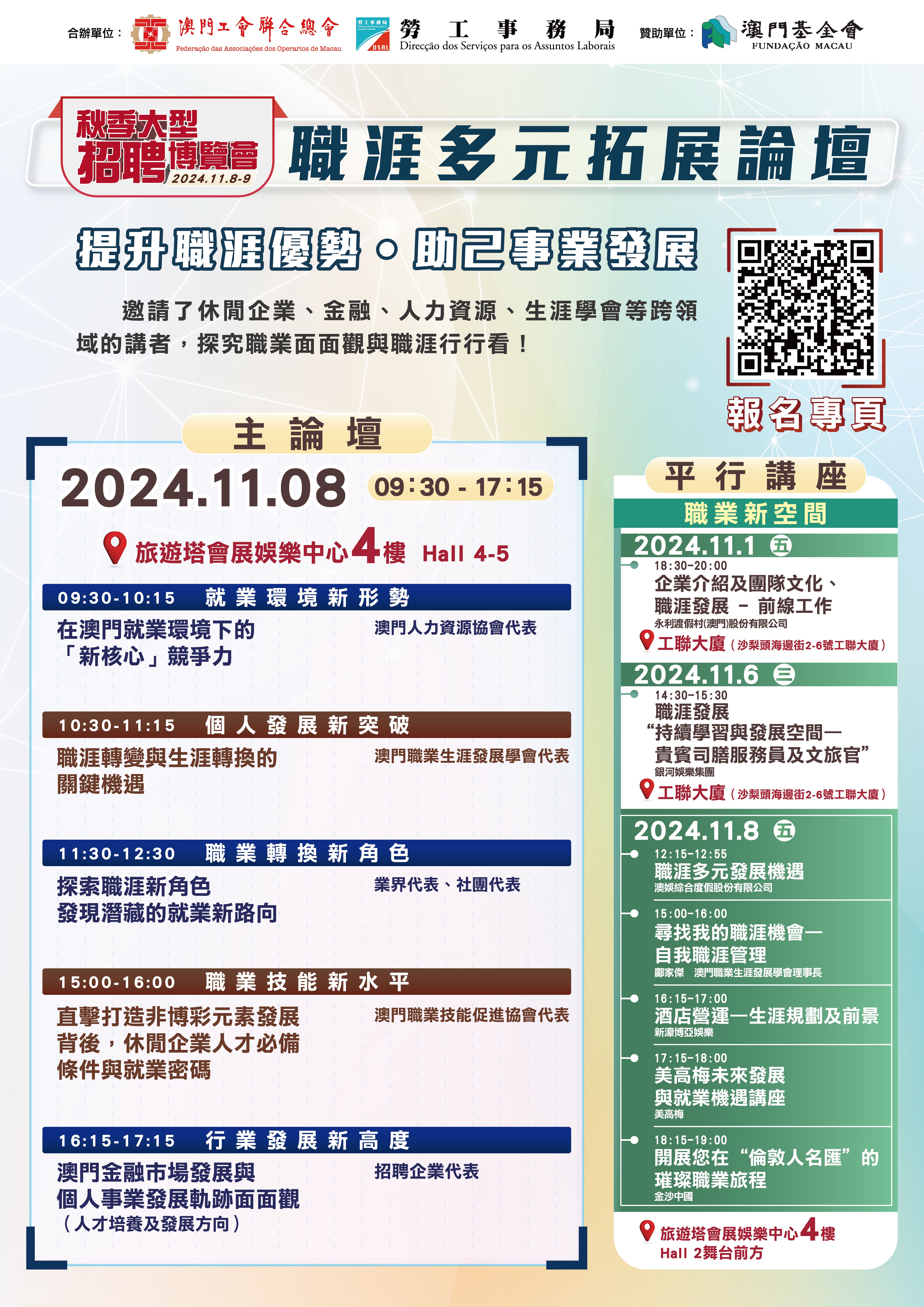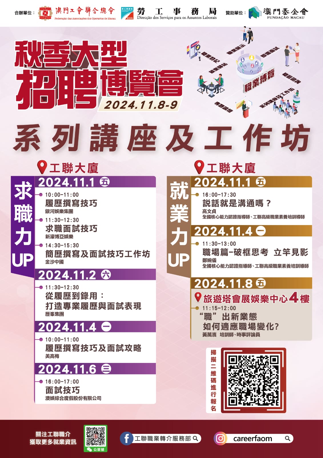 勞工事務局與澳門工會聯合總會將於11月8日至9日合辦 “2024秋季大型招聘博覽會”,並推出多場系列講座和工作坊,助力澳門居民強化求職技巧和職場競爭力。此外,活動首日(8日)又舉辦職涯多元拓展論壇,設5個分題,與澳門居民探討拓展多元化職涯發展。講座、工作坊及論壇,由即日起於網上報名;招聘會則由10月25日起於網上預約進場。