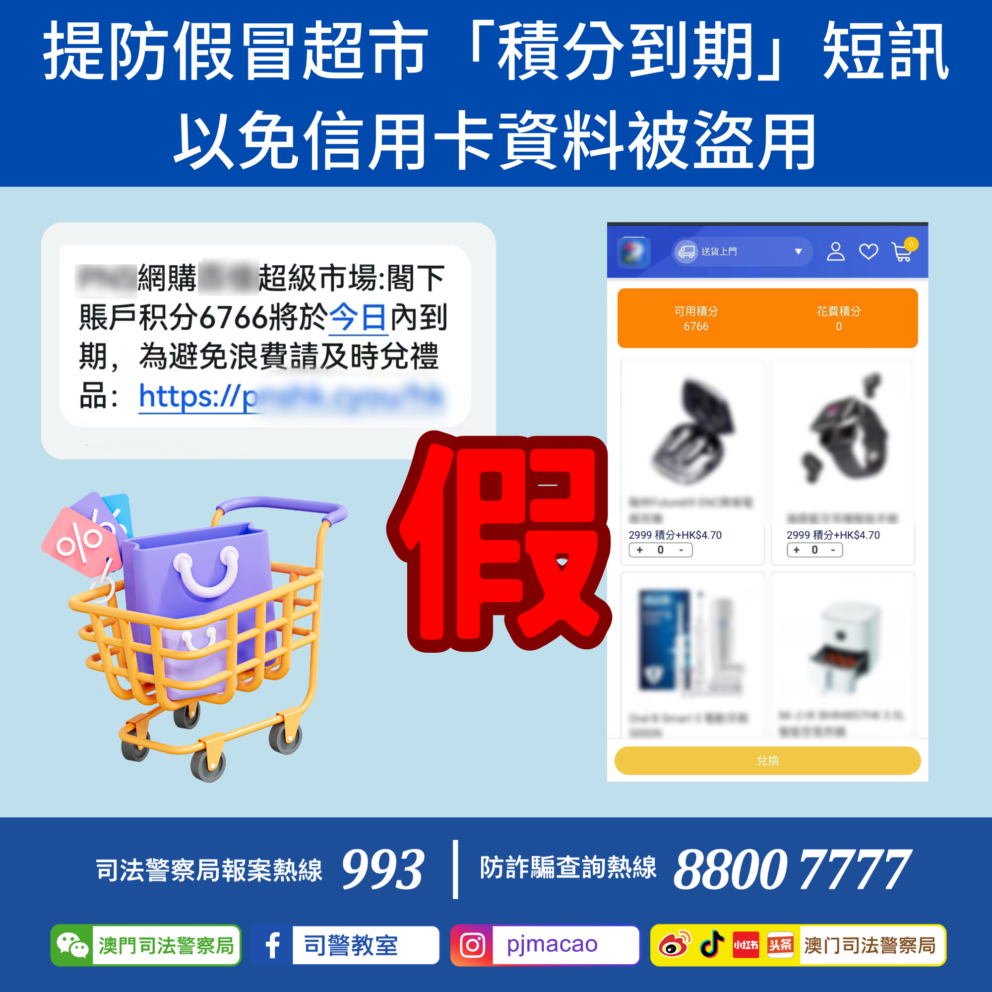 司警局於今日(10月20日)發現有騙徒假冒港澳大型連鎖超市向市民隨機發送釣魚短訊,訛稱市民帳戶積分即將到期,要求市民點擊短訊內附帶之連結進入一個假冒該超市的網站,誘騙市民輸入個人資料及信用卡資料以低價加積分換取禮品,藉此盜取市民的信用卡資料以進行非授權之大額交易。