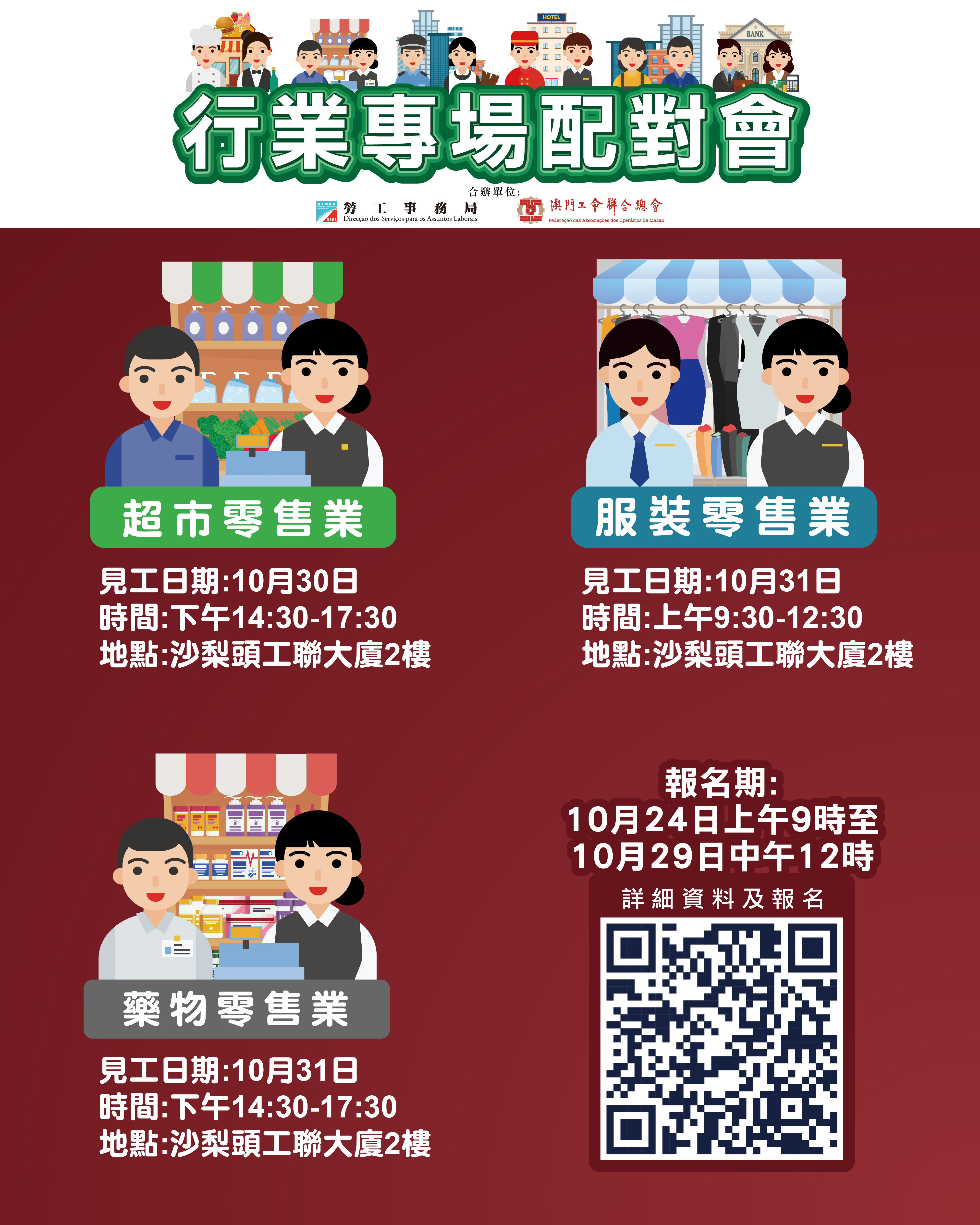 10月30日下午超市零售業配對會、10月31日上午服裝零售業配對會及下午藥物零售業配對會均在澳門工會聯合總會二樓(沙梨頭海邊街2-6號工聯大廈)舉行。報名日期為10月24日上午9時至10月29日中午12時。