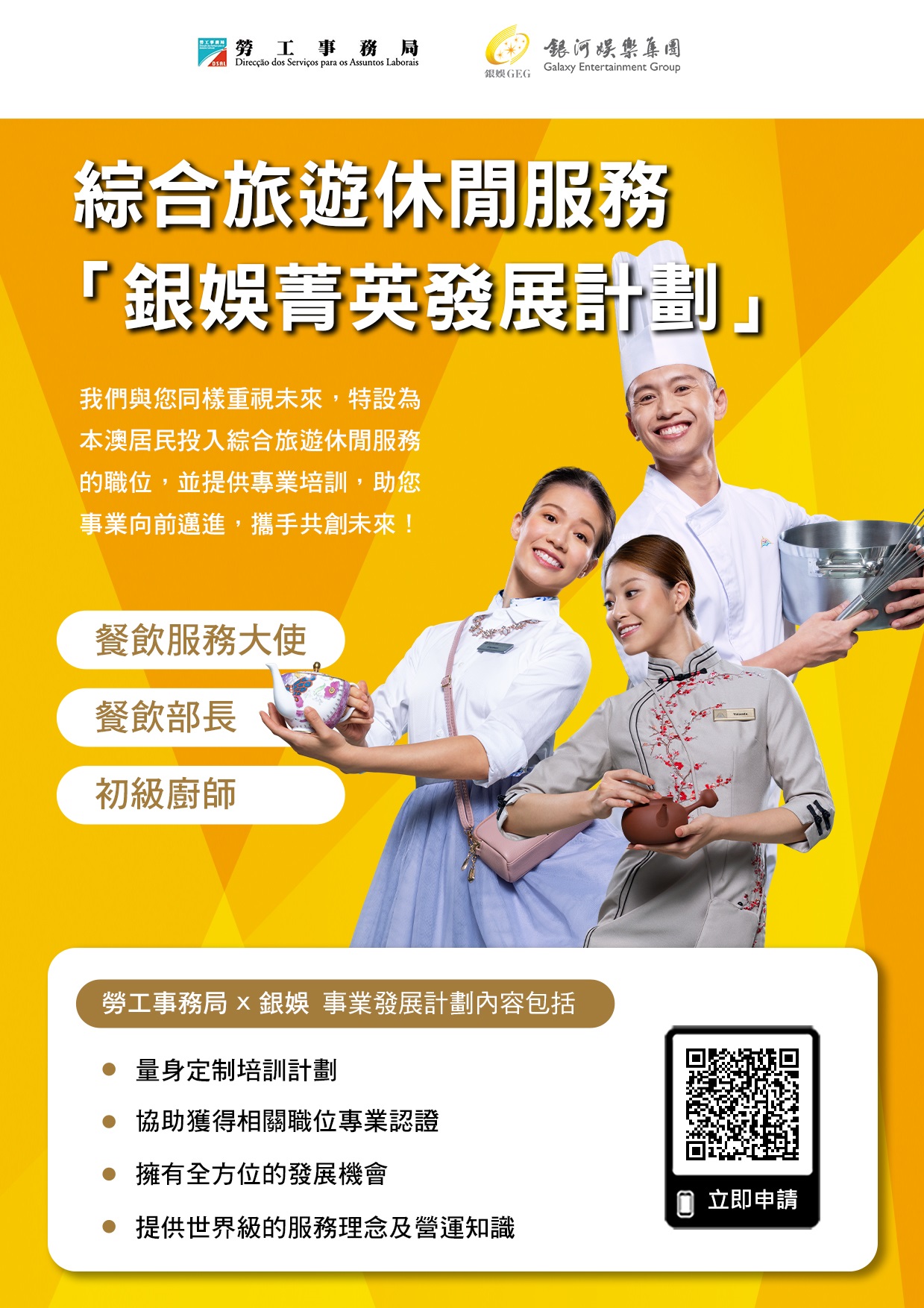 為支持本地人才全面發展,拓展多元職涯路向,勞工事務局和銀河娛樂集團(下稱“銀河娛樂")合作推出“銀娛菁英發展計劃(餐飲範疇)”(下稱“計劃"),以“先入職、後培訓”方式,為有志投身綜合休閒旅遊服務行業的澳門居民提供全方位培訓及發展階梯,計劃由10月29日起接受申請。