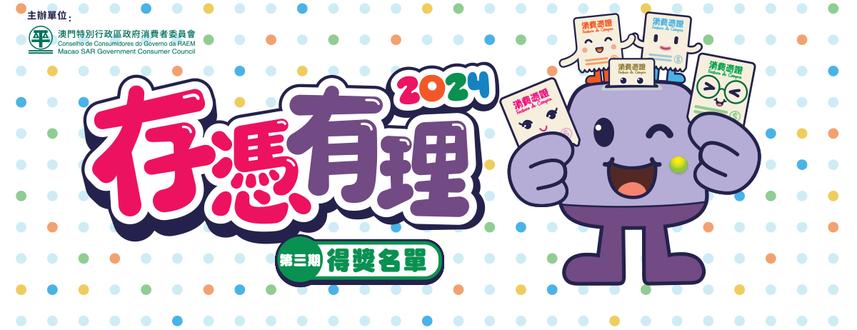 “存憑有理2024”第三期的得獎名單已公佈於消委會網頁(https://www.consumer.gov.mo),第三期的領獎時間至2024年11月29日。得獎者可於即日起選擇以下方式:(1)登入“一戶通”的“預約櫃枱服務”,在消委會的“誠信店服務專區”,或(2)致電消委會:8988 9315(選擇語言後按2)預約領獎時間,得獎者可登入消委會網頁查閱以親身或授權他人的領獎方式,以及領獎時所需出示的文件或資料。