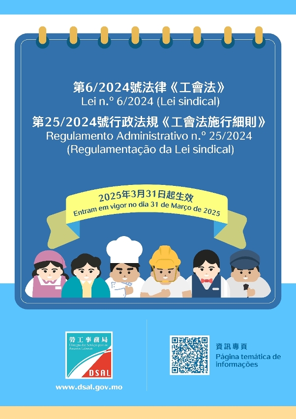 第6/2024號法律《工會法》及其補充性行政法規將於2025年3月31日正式生效,為了讓市民了解法例的內容,勞工事務局將於11月16日及29日舉辦兩場講解會,以簡明方式向參加者講解包括:工會及工會聯合會的組成及登記事宜、權利、義務及保障、機關及機關據位人,以及現存僱員社團的處理等內容。局方期望透過講解會,讓市民大眾了解相關法例的規定及須注意的事項。
