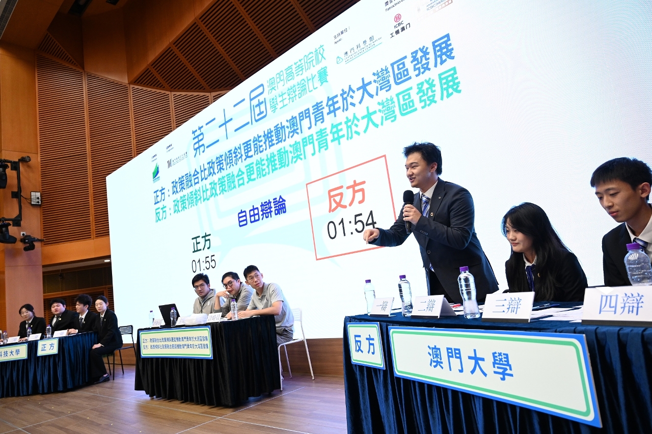 澳大隊伍於初賽第一場“虛擬數字人將會成為/不會成為直播帶貨行業的趨勢”表現出色,以5:0擊敗澳門理工大學隊伍;澳大科技學院、鄭裕彤書院學生房芮羽獲該場“最佳辯手”獎。初賽第二場以“現今澳門青年以追求生活品質/工作成就為目標更可取”為辯題,澳大隊伍以3:2的成績戰勝澳門城市大學隊伍。準決賽辯題為“澳門政府應不應該優先支援中小微企業”,澳大隊伍以5:0的成績戰勝澳門城市大學隊伍;澳大協同創新研究院碩士生王睿思獲該場“最佳辯手”獎。決賽辯題為“政策融合比政策傾斜/政策傾斜比政策融合更能推動澳門青年於大灣區發展”,雙方隊伍在澳門青年現狀、大灣區政策前景等方面展開激烈辯論。最終,澳大隊伍以3:2戰勝澳門科技大學隊伍奪得冠軍。