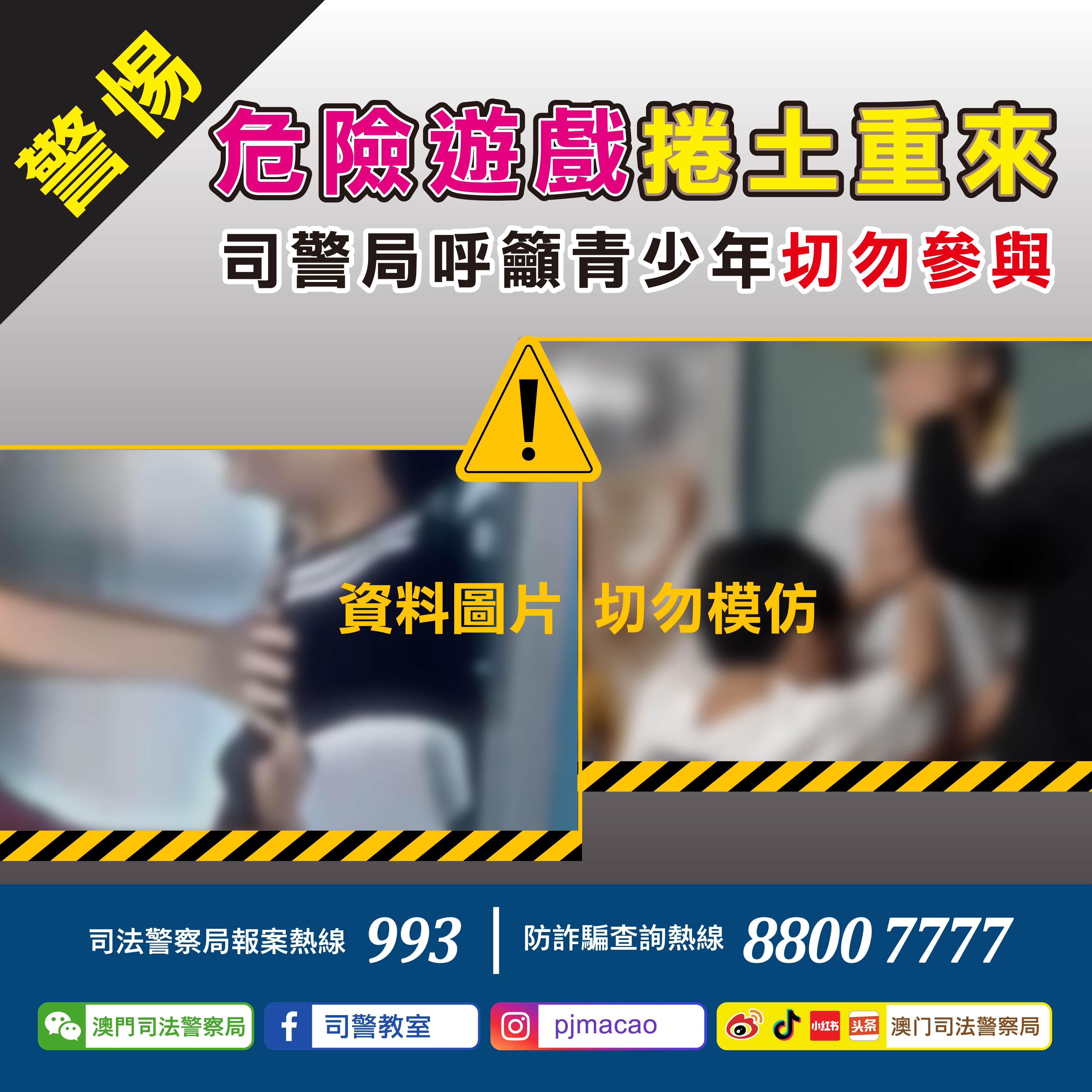 司警局在此特別提醒青少年玩樂時須注意安全並衡量後果,切勿為尋求一時刺激或抱持惡作劇心態而參與或模仿危險遊戲和行為,以免危及他人生命安全,導致悲劇發生並負上刑事責任。