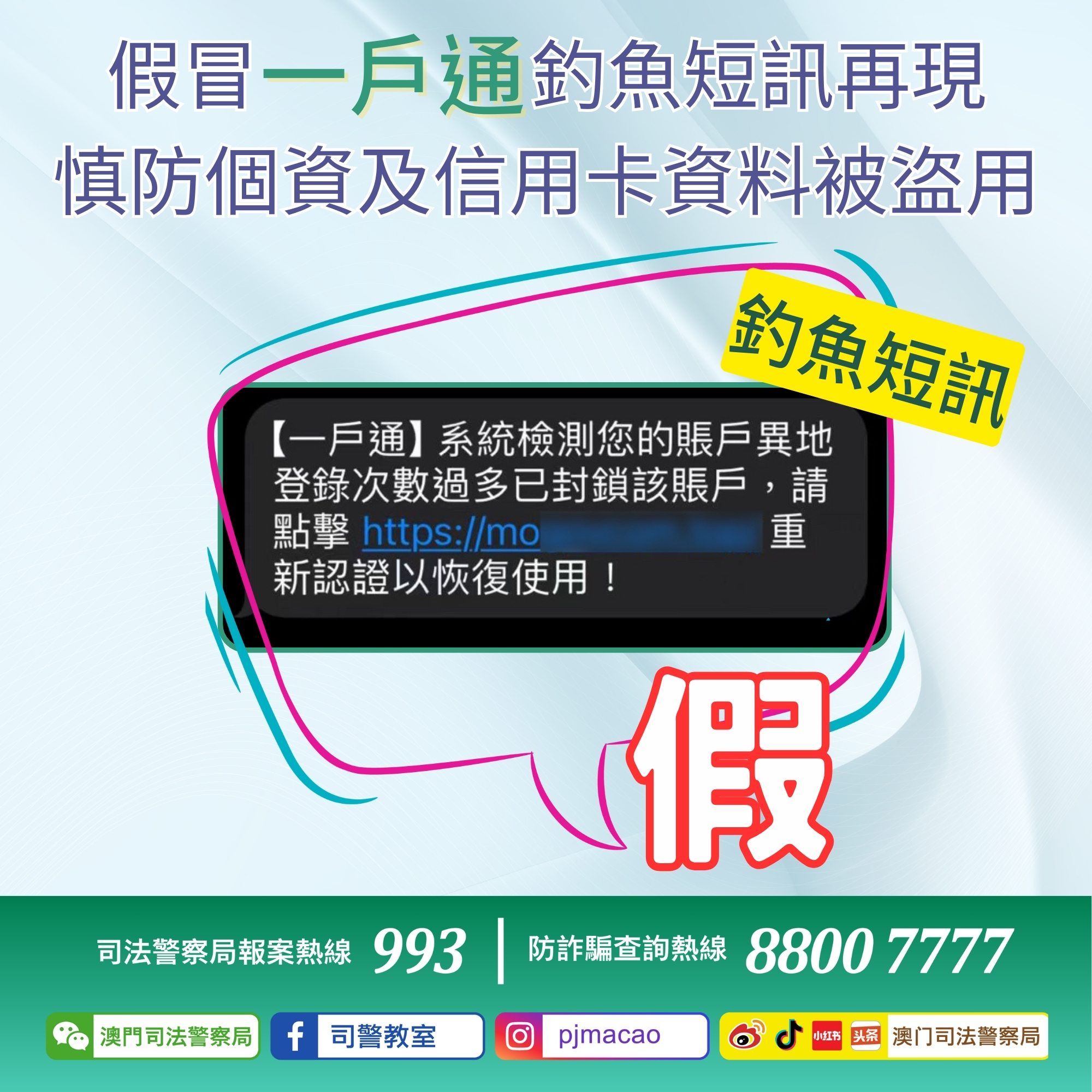 近月釣魚詐騙短訊猖獗,騙徒利用釣魚短訊成功套取信用卡資料後,再進行非授權的大額交易,造成多名市民損失,司法警察局反詐騙協調中心再次強烈呼籲市民: