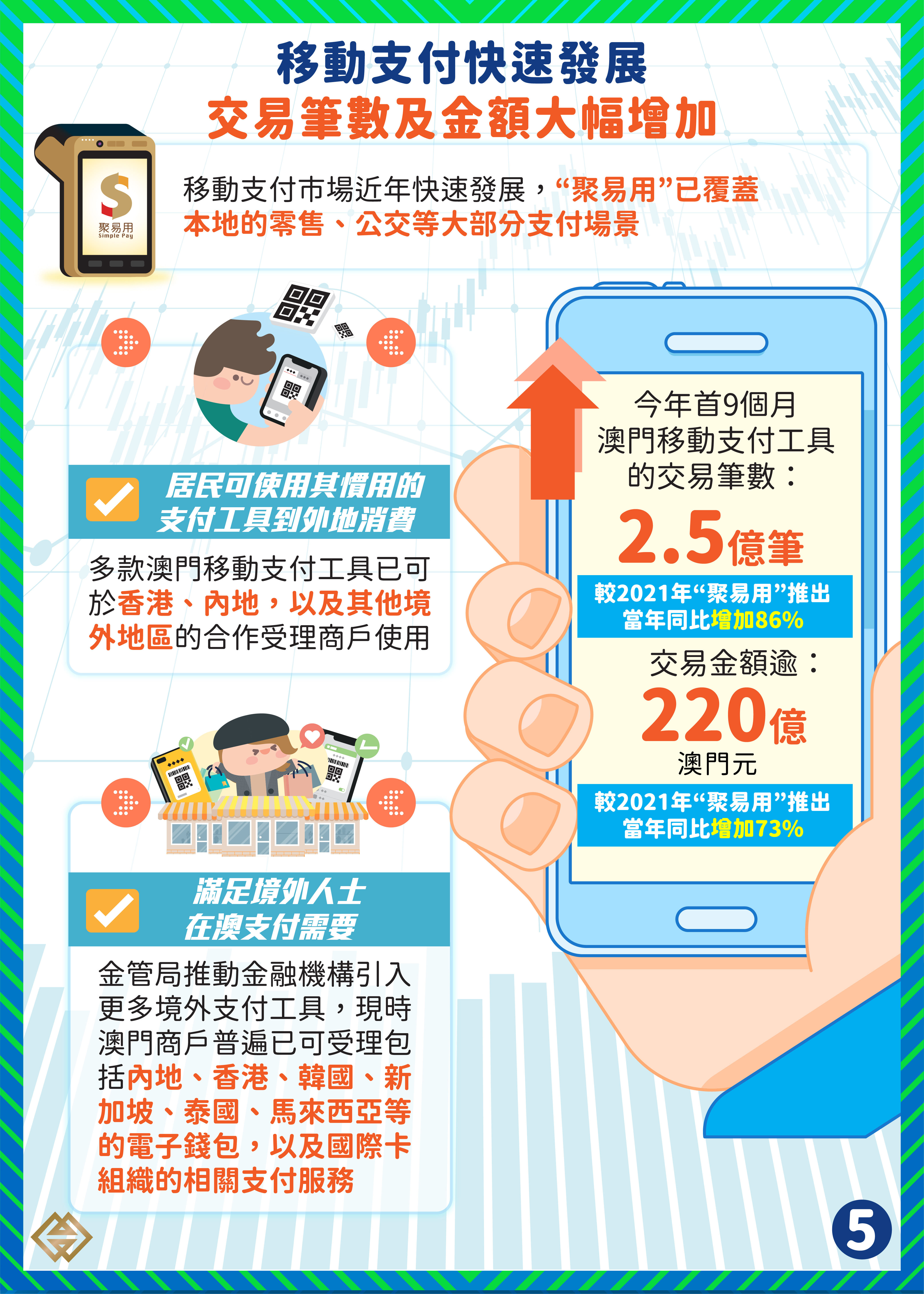 今年首9個月,澳門移動支付交易筆數已達2億5千萬筆,金額超過220億元,較2021年“聚易用”推出當年分別同比增加86%及73%。