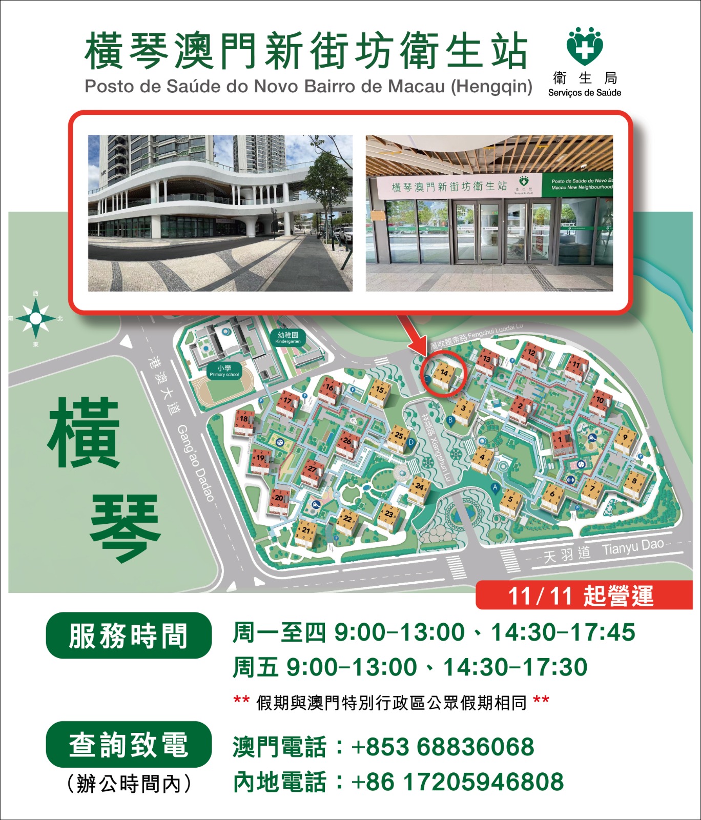 衛生站佔地1,000平方米,於11月11日(星期一)起正式營運,參照澳門特別行政區的衛生中心運營模式,首階段提供成人保健、婦女保健、兒童保健及非預約門診等西醫服務,主要包括常見慢性病(如高血壓)及普通急性病(如感冒發燒)的治療;若患者需要專科醫療跟進,會按現行模式轉介至仁伯爵綜合醫院或澳門協和醫院;此外,若遇緊急醫療情況,患者會先轉送至深合區的廣州醫科大學附屬第一醫院橫琴醫院進行緊急救治,後續治療可根據患者意願,在病情許可的條件下轉回澳門特別行政區的醫院繼續治療。