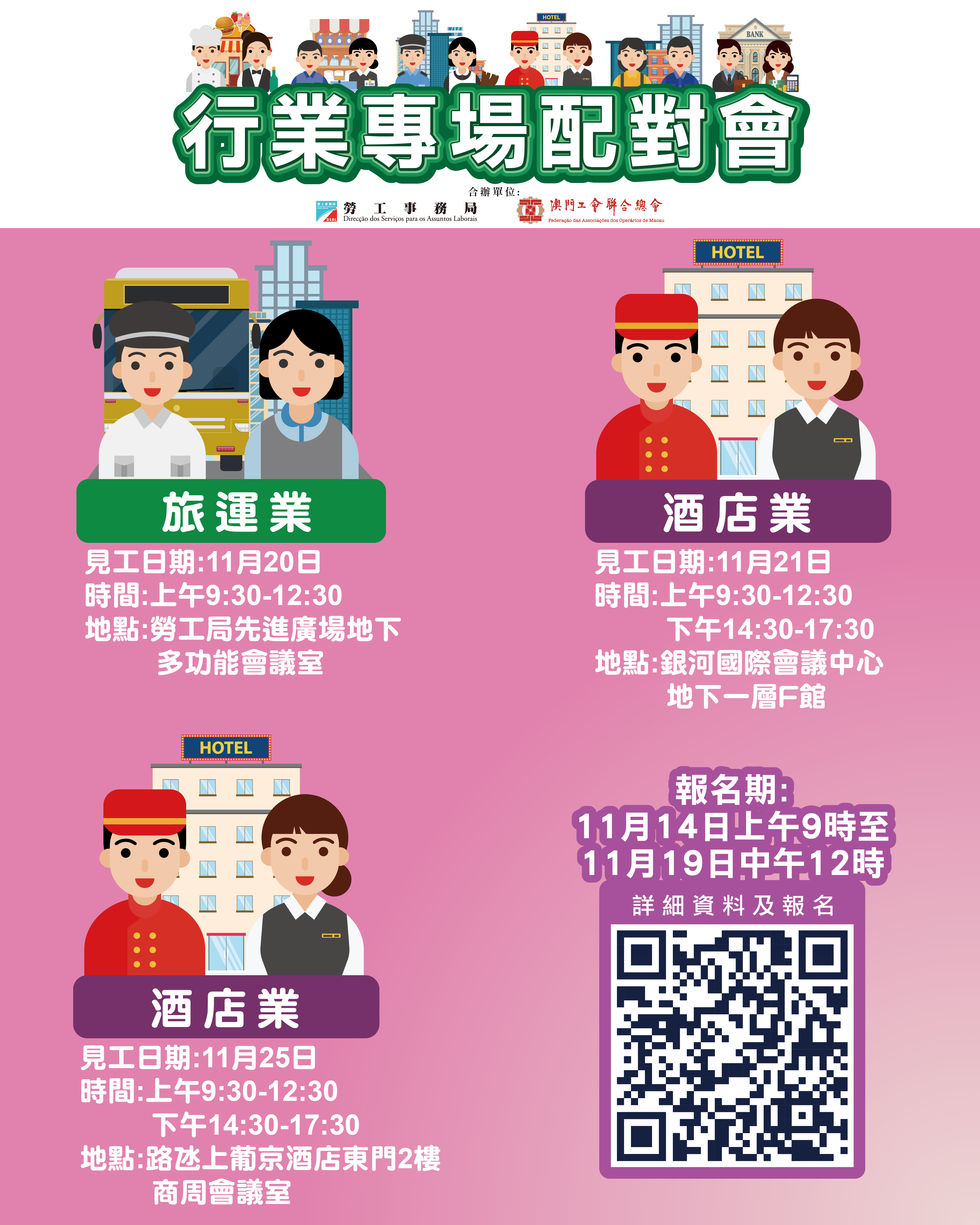 11月20日上午舉辦旅運業配對會,提供20個職位空缺,涉及站務員及車長。配對會在澳門勞工事務局地下多功能會議室(澳門馬揸度博士大馬路221-279號先進廣場大廈)舉行。