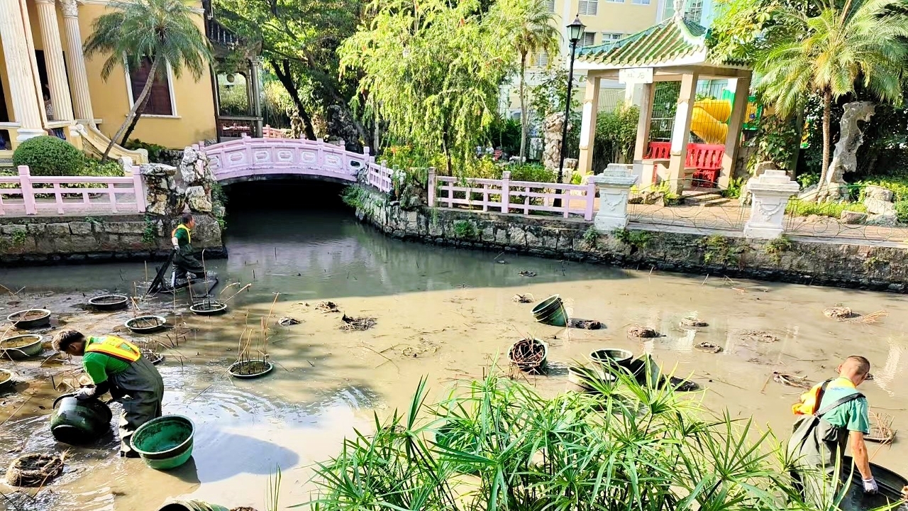 市政署抽去池塘大部份池水以清理底部沉積的淤泥及雜物。
