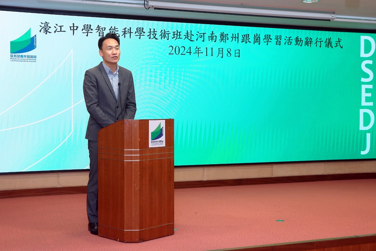教育及青年發展局積極推動學校開辦資訊科技教學、STEM課程和編程教育,培養學生的科學素養、專業技能及科技視野。濠江中學高中“智能科學與技術課程”於本年11月10日至16日前往河南省鄭州市的科技企業進行跟崗學習,由30名師生組成的代表團於日前到教青局辭行。教青局局長龔志明、副局長黃嘉祺,濠江中學副校長陳虹、周明,以及協助在鄭州當地學習事項的澳門潤達軟通科技有限公司董事長顏遠港,軟通智慧科技有限公司總經理張夢弛等出席辭行儀式。