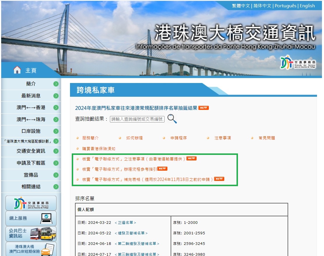 就澳門私家車往來港澳常規配額新申請,須於香港牌證之預計生效日期前的三個月內進行“電子聯絡方式”的核實環節。申請人可在11月18日起透過澳門交通事務局網站內之查詢服務辦理進度(https://www.dsat.gov.mo/web_sp_status/services_status.aspx )了解香港牌證之預計生效日期,相關生效日期會在澳方審批通過及文件送交港方後顯示。倘相關流動電話或電郵未獲核實,港方亦將不會處理有關申請。因此,申請人務必按期限進行“電子聯絡方式”之核實,逾期須重新辦理核實手續。